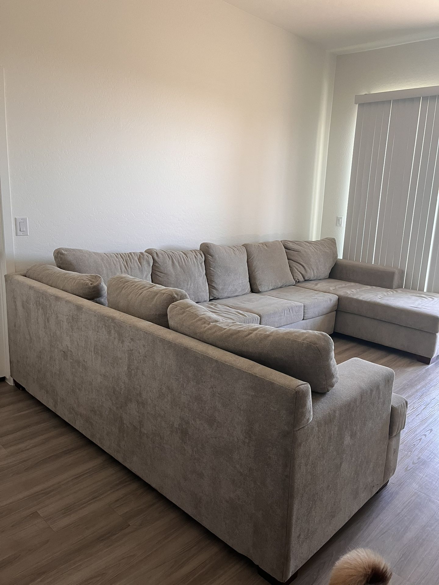 Needs a cleaning and wood chipped on corner piece. (Picture included) Otherwise, in great condition. Just moved and current layout doesn't support this big of a sectional very well so I need to downsize. MUST PICKUP!! Shoot me offers!