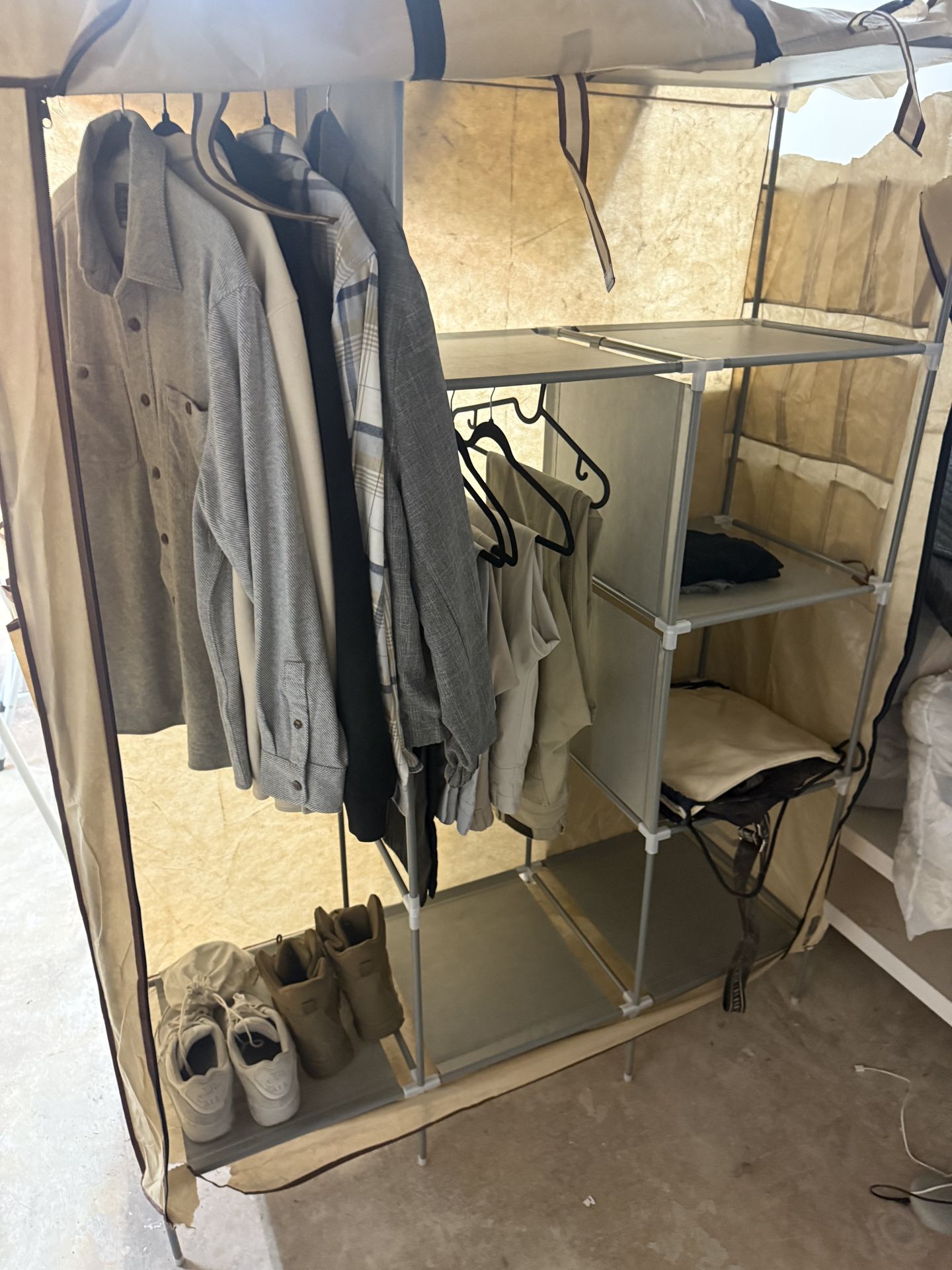 This is a portable wardrobe closet I assembled about a week ago. It’s super lightweight. The cover part is ripped in many places because it very thin and I assembled that part incorrectly but the shelves and everything else are working perfectly. IT CAN BE TAKEN APART IN UNDER A MINUTE. The whole thing is very light weight and seems to be very sturdy. $40 OBO