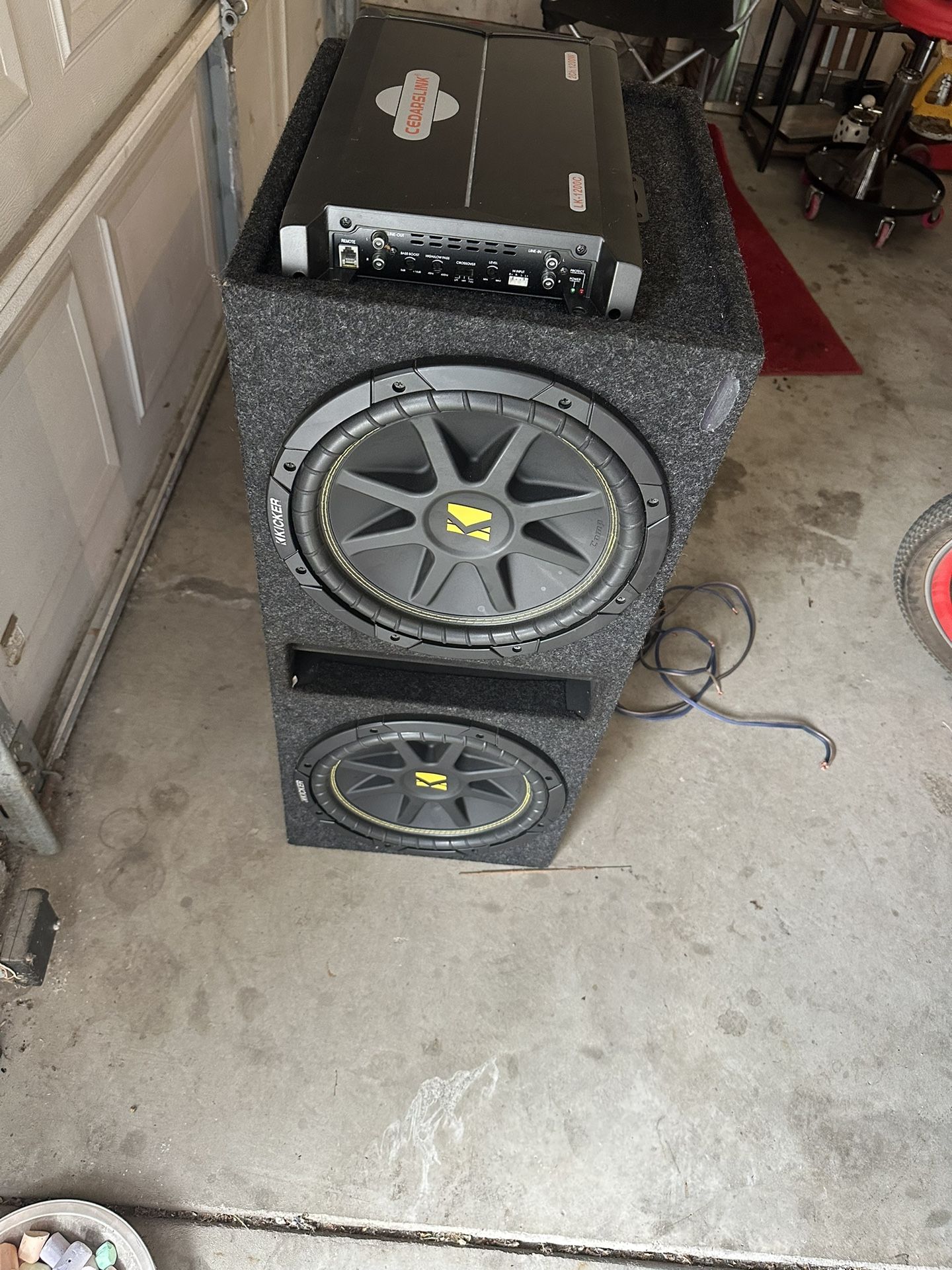 I have 2 12”kickers with the box 1200 watt cedar amp slaps hard came out of my truck 400 firm come get it