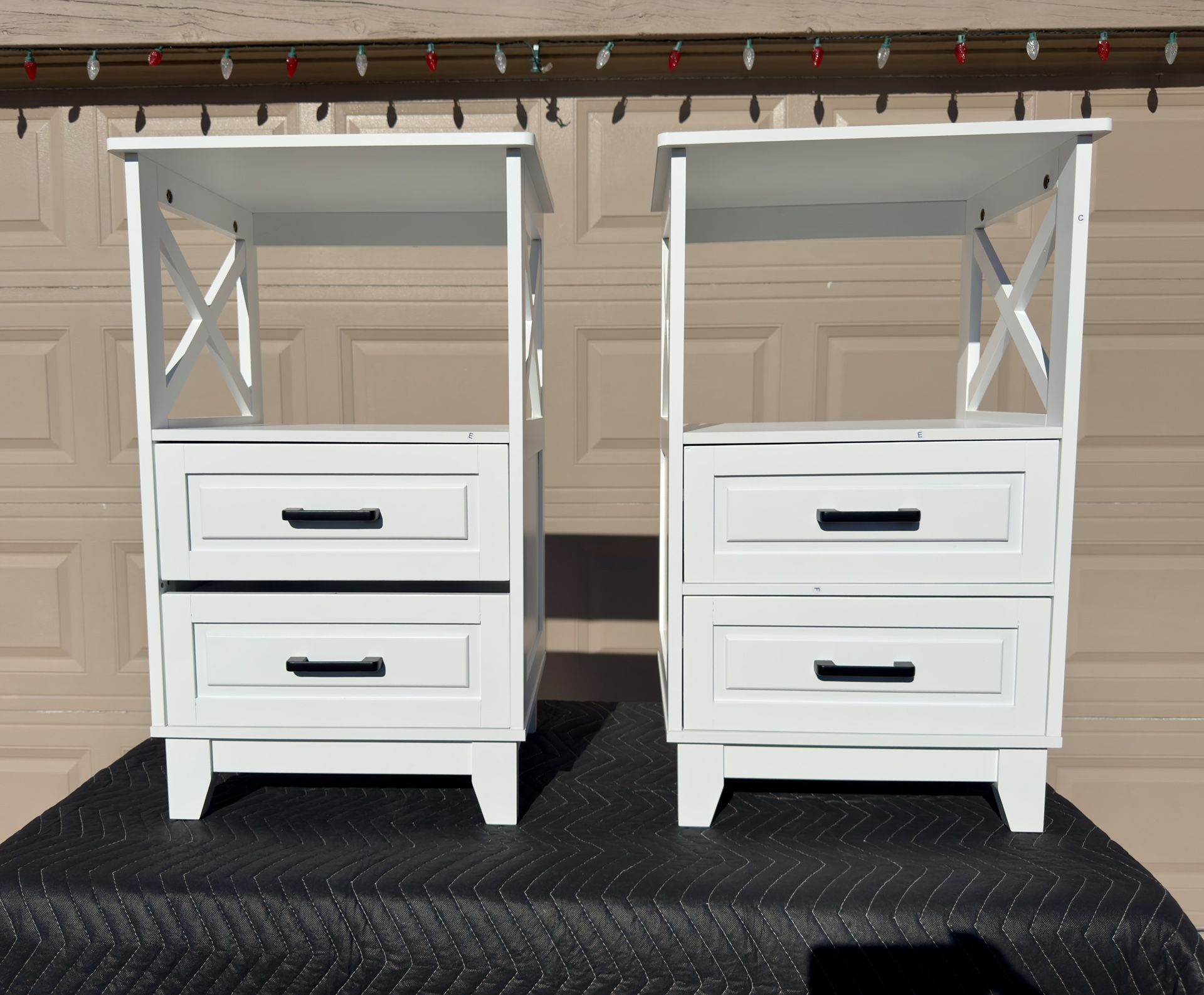 BOTH ARE NEW 1 IS MISSING CENTER PIECE BUT IS STILL FULLY FUNCTIONAL PLS LET ME KNOW IF YOUR WANT TO CHECK IT OUT ! At RoyalCraft, we offer a diverse range of elegant and practical solutions for your home. Whether you wish to upgrade your entertainment area, enhance the aesthetics of your bedroom, or infuse a touch of modern charm into your living space, our home decor and furniture collections are thoughtfully designed to cater to your various needs.Our products are distinguished by their unique designs and impeccable craftsmanship, delivering the perfect blend of comfort, aesthetics, and functionality. Whether you are searching for a TV cabinet, vanity table, acrylic stools, coffee table, or bed, RoyalCraft presents an impressive array of choices. Product Dimensions: 13.8"D x 17.8"W x 29.8"H Color White: 1 Count Table design: Nightstand Special Feature: X Structure • THOUGHTFULLY MADE- The white nightstand is crafted from a blend of solid pine and manufactured wood for an extra sturdy and durable piece that’s built to last. Its water-based coating with low VOC is splashproof yet family-friendly. Best of all? Supported by anti-tip straps, this end table’s 2 under-shelf drawers lower the center of gravity downward for exceptional stability. • EASY AND STYLISH- This tall white nightstand is brimming with farmhouse-meets-modern flair: It has a clean silhouette, tapered legs, open shelf with X-shaped accents on the sides, all finished in a crispy white tone that highlights the beauty of the nightstand while the black handles make a touch of contrast. Plus, the top tier has rounded corners for an elegant look and safety. • AMPLE STORAGE- Gliding smoothly on the metal track, the 2 soft-close drawers of the bedside tables are perfect for out-of-sight storage. The sleek handles allow for an effortless pull in or out, so you can tuck away necessities in delightfully handy. Best of all? The night table top and upper shelf offer more than enough room for showing off your to-read books and potted plants. • AMPLE STORAGE- Gliding smoothly on the metal track, the 2 soft-close drawers of the bedside tables are perfect for out-of-sight storage. The sleek handles allow for an effortless pull in or out, so you can tuck away necessities in delightfully handy. Best of all? The night table top and upper shelf offer more than enough room for showing off your to-read books and potted plants. • VERSATILE FORM- The well-made side tables with an understated look that pairs well with just about any design aesthetic. It’s right at home next to your bed in the bedroom, plus it can also function as an end table in your living room or a storage chest in the entryway. Why not add this white nightstand to your house for both decorative and functional? • BREEZILY ASSEMBLE&FRESHEN UP- The bedroom table comes with easy-to-follow instructions and necessary tools for an easy assembly process. Its solid wood tabletop is treated as water-repellent while providing the function you need to store and entertain. When the bed stand needs a little freshening up, we suggest applying it with a soft damp cloth