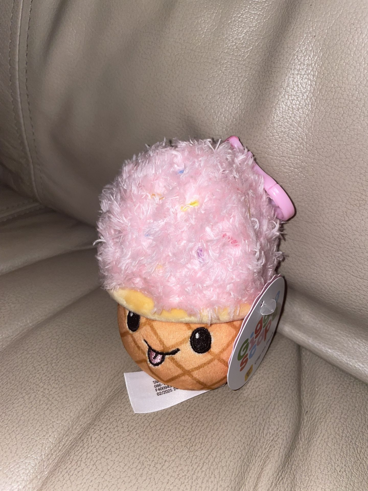 Adorable pink ice cream clip-on plush. Features a cute waffle cone design. New with Tags. Gigglescape Brand.