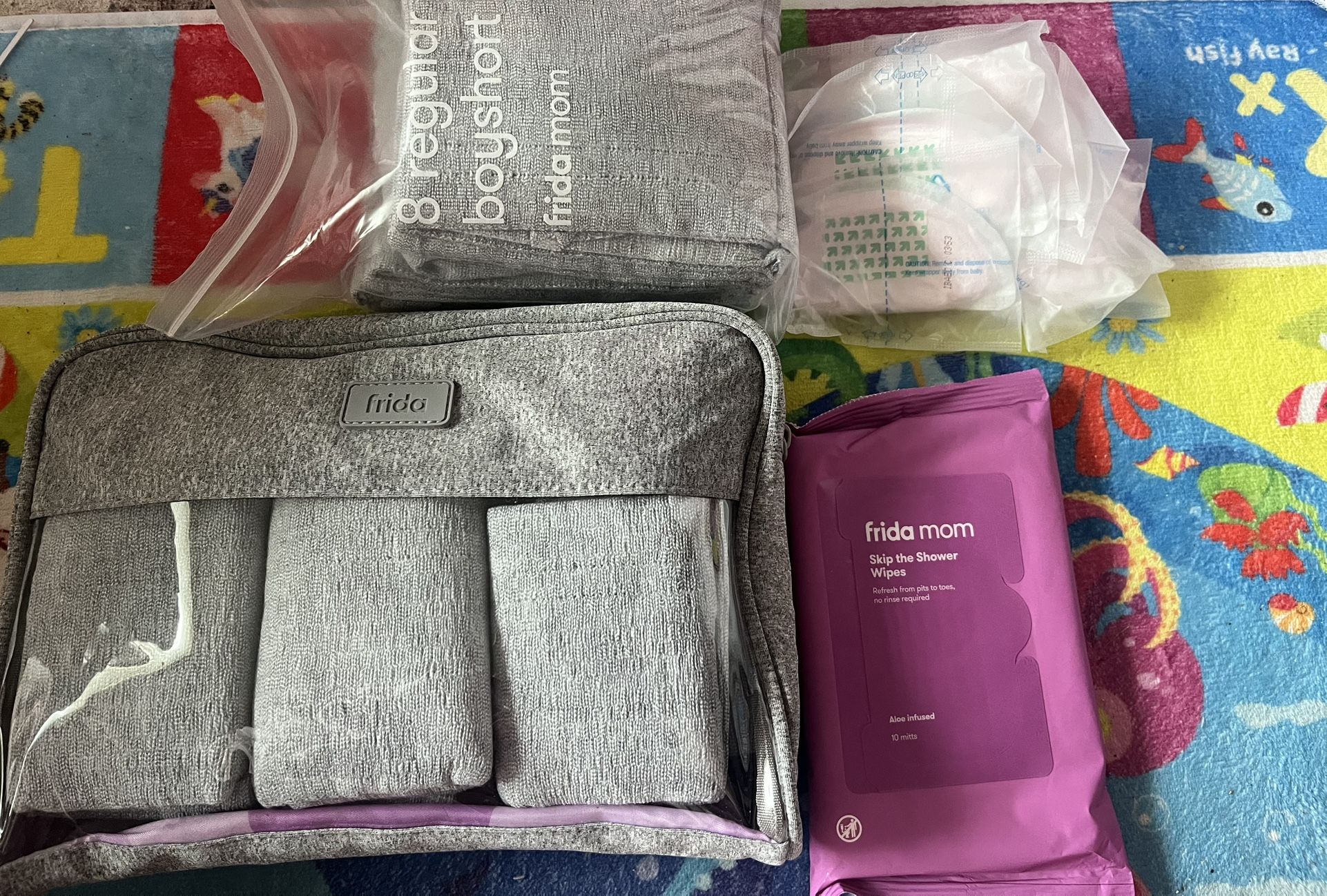 Opened, never used 13 Frida postpartum boyshorts, 10 nursing pads, 1 pair non slip socks, a brand new slip the shower wipes & a beautiful light pink Medium L&D grown that never been used but opened and washed in Dreft newborn detergent. And a lightly used newborn balm.