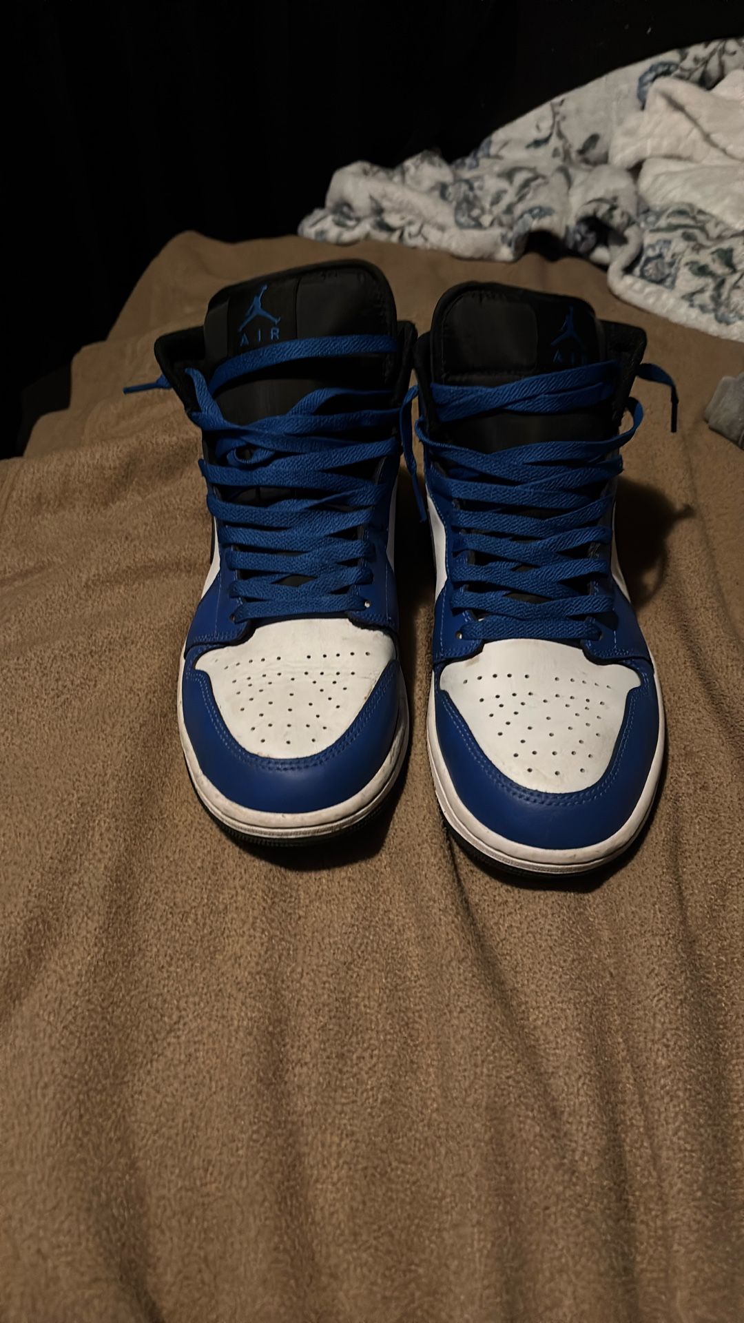Blue white and black mid tops size 10 men great condition no scratches basically new just a white paint stain no box will be cleaned before purchase
