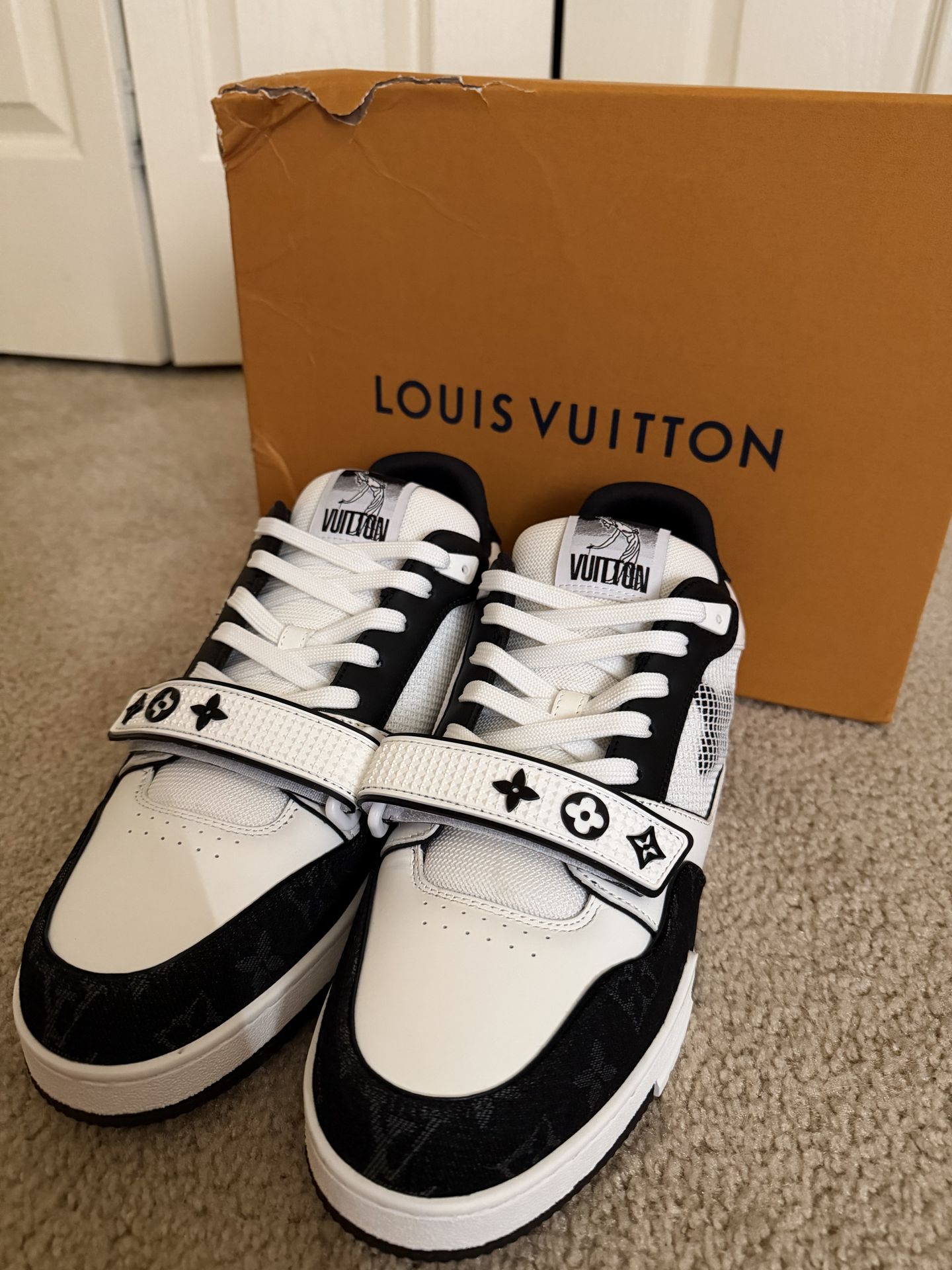 Louis Vuitton LV Trainer Sneaker Black/White Size 10 Monogram Denim with Straps Damaged box from being dropped Barely worn