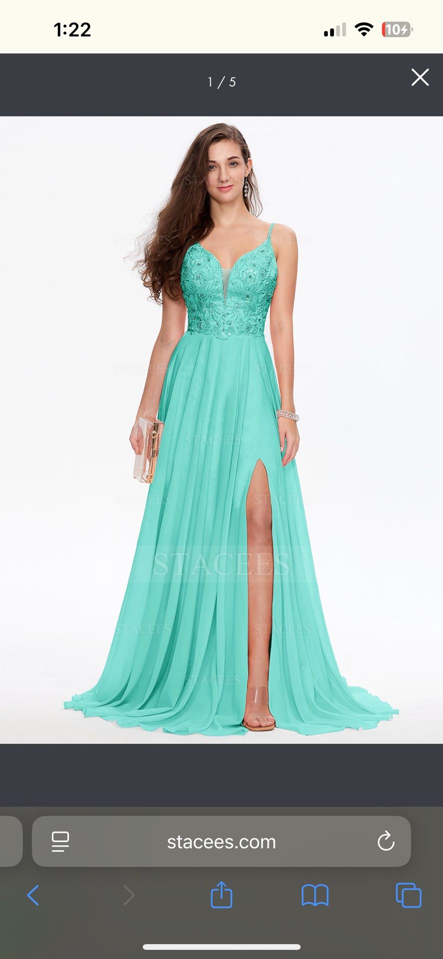 A-line V Neck Sleeveless Chiffon Long/Floor-Length Prom Dress With Beading Split Sequins. This dress is outstanding beautiful.. SIMPLY GORGEOUS. Unfortunately, my daughter was not able to use it due to it arriving super late for her prom. This was Bought at the Stacees website for over $200 dollars. I am asking for $150 or OBO . This dress is NEW and has never been used !!