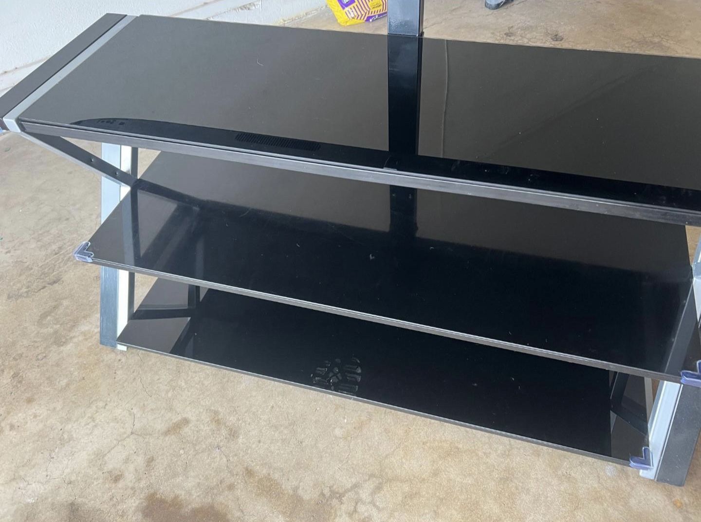 Modern Glass TV Stand / Entertainment Center Sleek black glass TV stand with sturdy metal frame. Modern look and solid build. • Fits TVs up to approximately 65” • Black tempered glass shelves • Strong metal frame • Fully disassembled and stored for easy transport • All stand hardware included • Glass is in good condition — no cracks or chips • TV mount not included (stand does not require a mount) Photos show the stand assembled prior to disassembly. Price: $75 OBO Pickup from storage unit. Cash or Zelle.