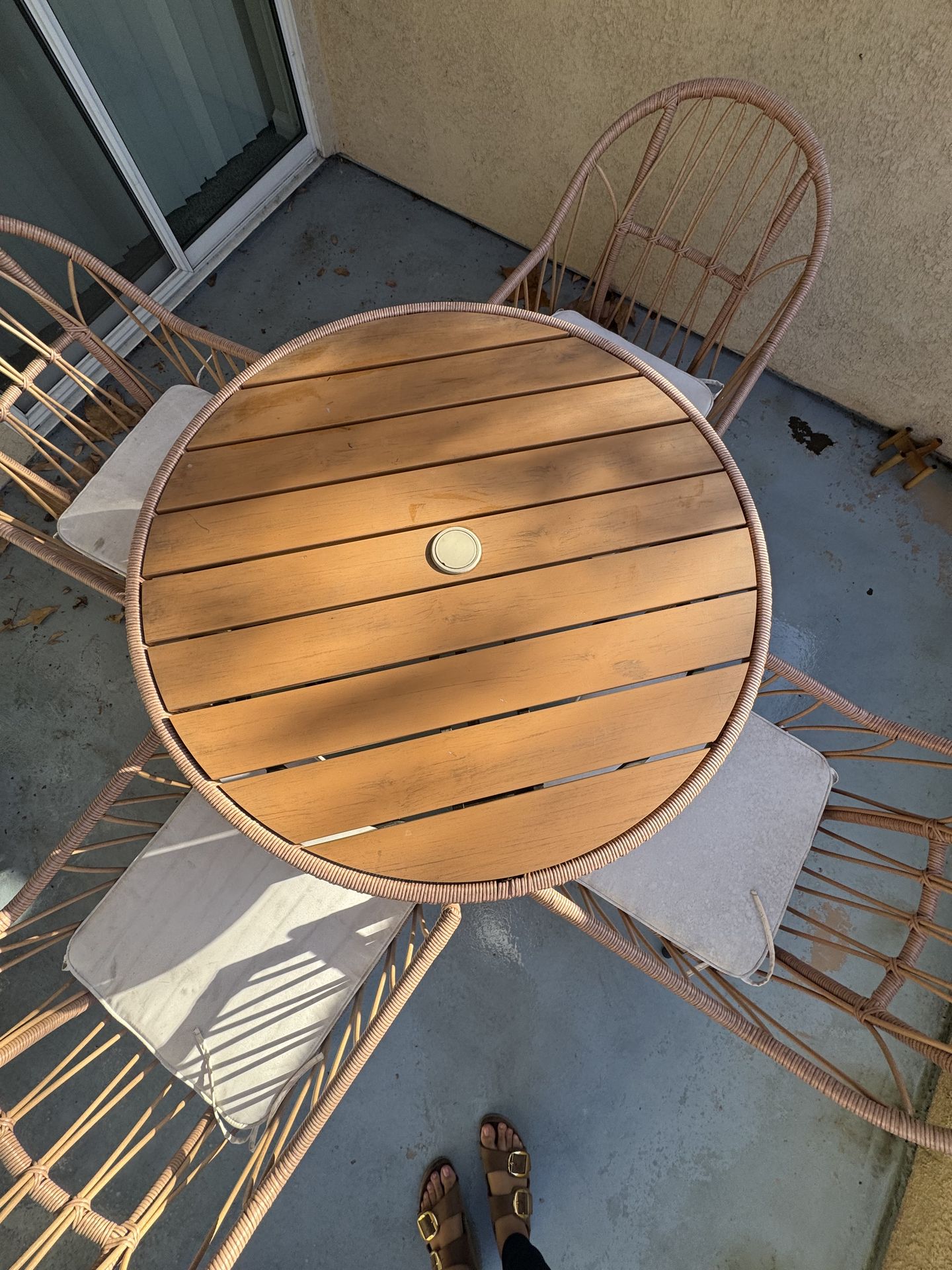 MOVING SALE Round outdoor table with 4 matching wicker chairs and cushions. Cushions may need covers. (Not included) Good used condition, solid and comfortable. Great for outdoor dining or entertaining. Pickup only.