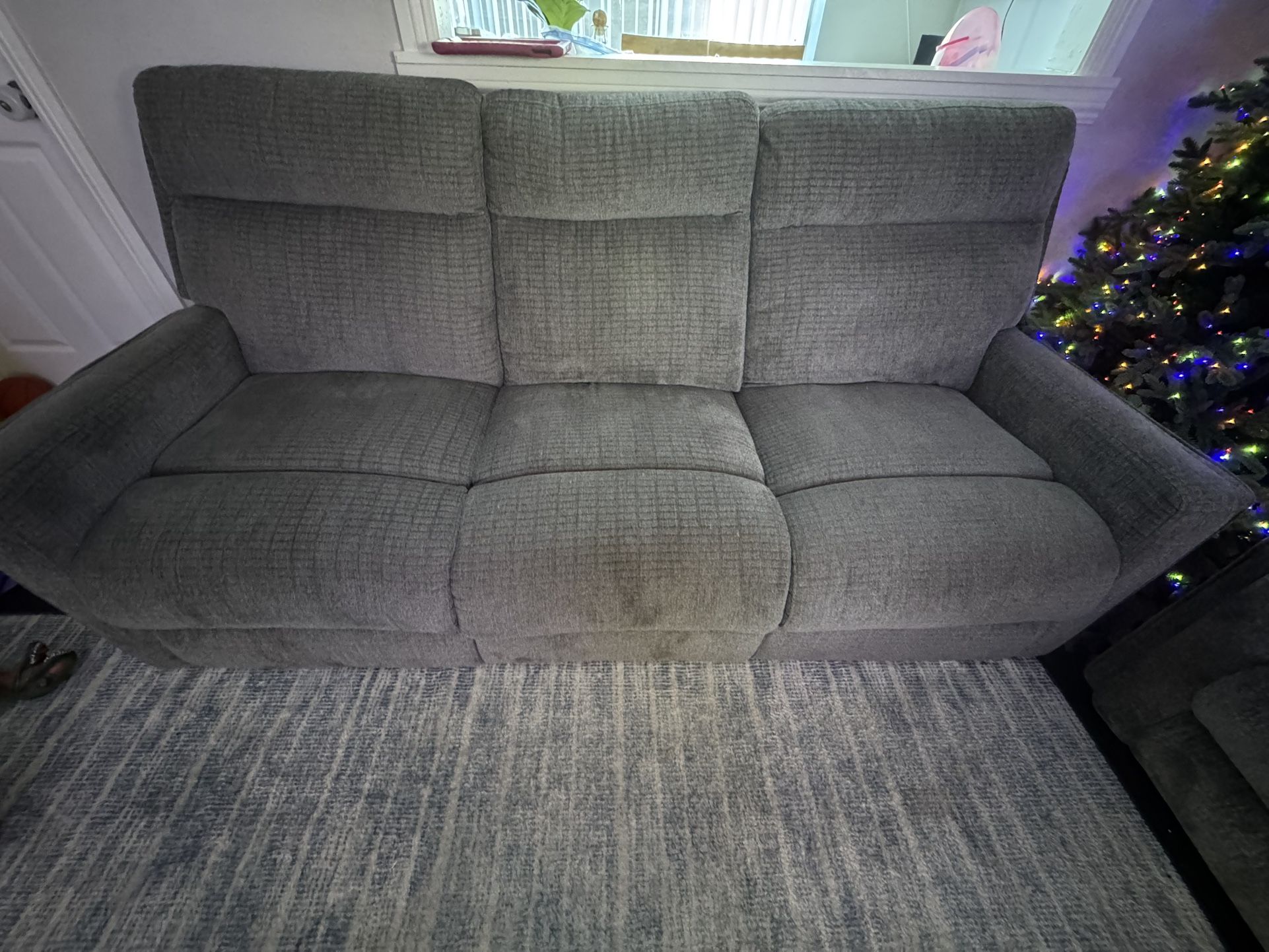 3 seat couch is in great condition. Both sides recline just fine 2 seat couch has outlet and usb ports in middle console. It also has a small tear at seam (as shown in picture) on one seat. Also reclines just fine! Both couches have usb ports on the ends of couches next to the recline button Bought new 9 months ago for more than $2000. These just don’t work for our family Smoke & pet free home Please no lowballs.