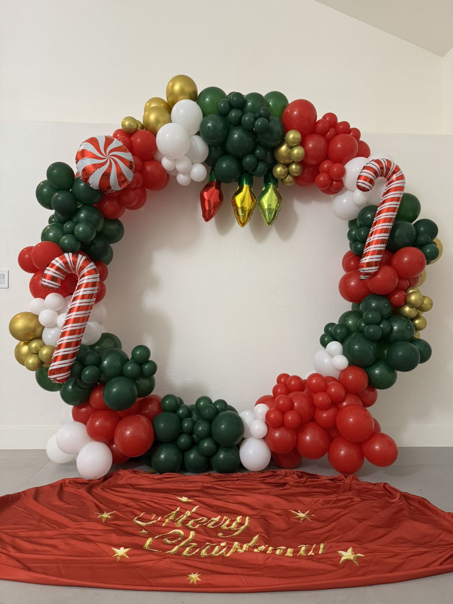 Used Christmas balloons, originally on a circle arch but took it apart and I strung them together. About 18 feet long, you can cut the string to make it shorter. *Only balloons, does not come with arch.