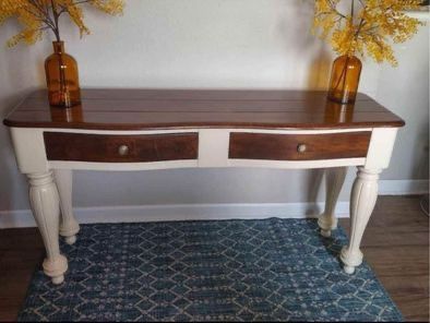 Elegant Serpentine Carved wood stained and sealed Console/Entry table with Rolled legs A custom butter cream finish with wood stained top and vintage knob drawers. Chunky farmhouse turned post legs Can be multi-use as Console,Entry table, Desk Pick up Renton Or Curbside delivery available for a fee !! đź—ŁUnavailable Friday eve - Saturday eve For inquiries during those times we will respond Sunday Thanks D-1ft 3 3/8 in W-4 ft 6 3/4 in L-2 ft 4 3/8 in