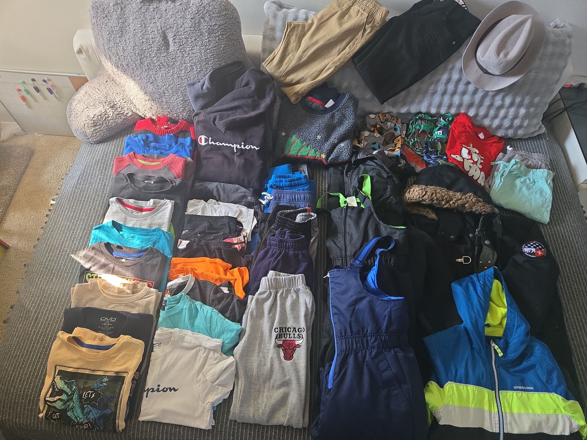 Size 10-12 10 long sleeves shirts, 8 short sleeves shirts, 2 hoodies, 5 pajamas, 2 shorts, 2 casual pants, 1 hat, 6 pants, 3 snow pants, 2 winter jackets Everything for $100