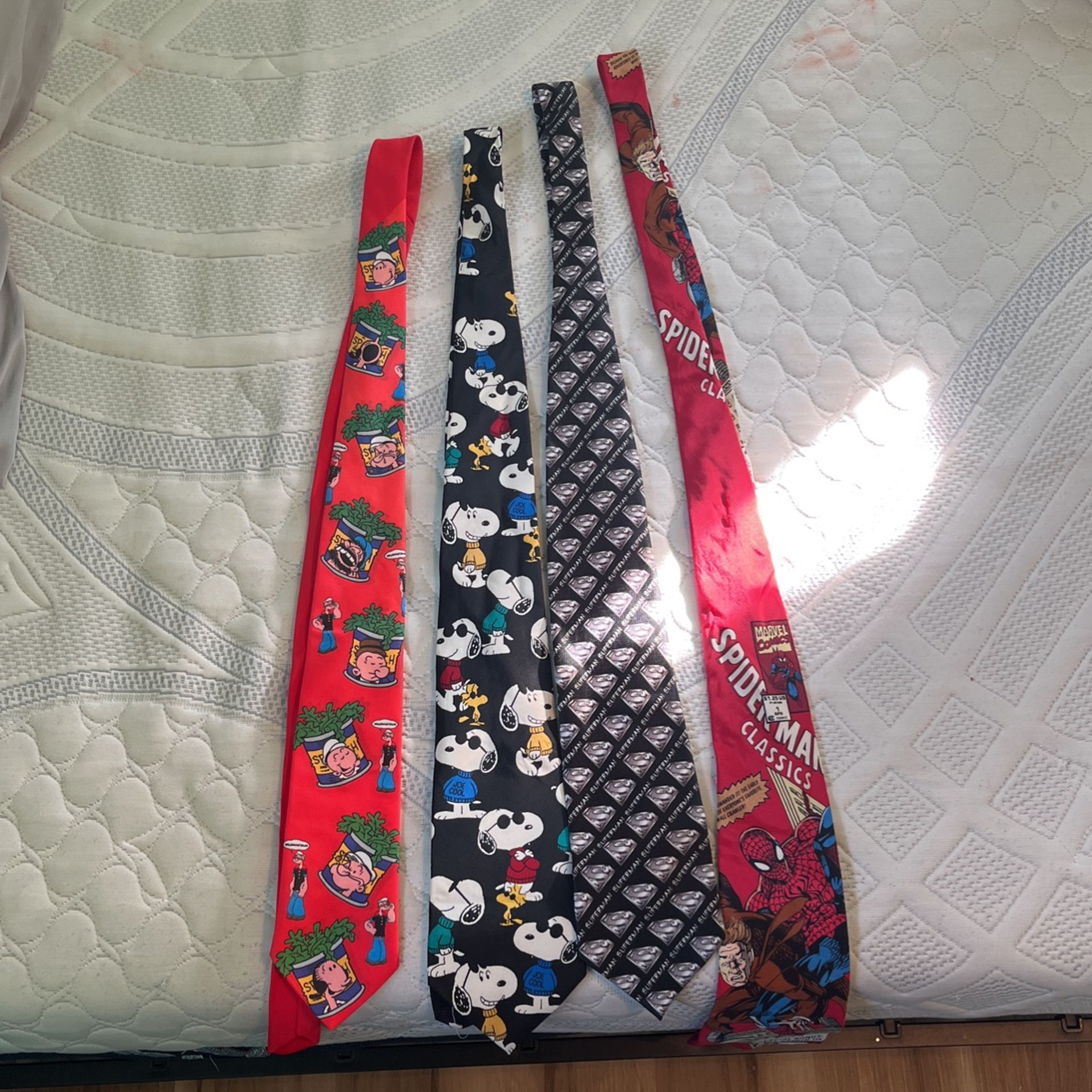 4 neck ties for sale. $5 each separately all together in a bundle would be $10. i got these thrifted in SB! Popeye show tie, snoopy tie, superman steel logo tie, and spiderman classics tie. accepting cash, zelle, and venmo :)