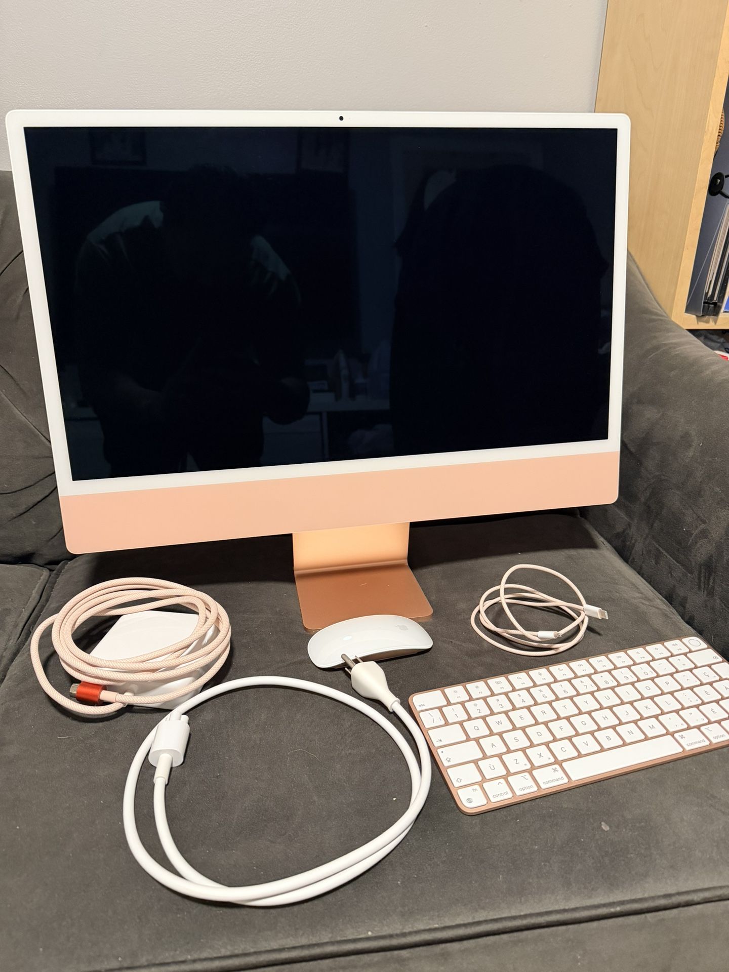 Bought brand new. Open box. Used once to check if it works. Reminder: Canadian Keyboard!!!! Apple 24" iMac with M1 Chip (Mid 2021) 4480 x 2520 Non-Touch Retina Display, Apple M1 8-Core CPU, DRAM, NVMe SSD, Apple 8-Core GPU, Wi-Fi 6, FaceTime HD 1080p Camera, macOS