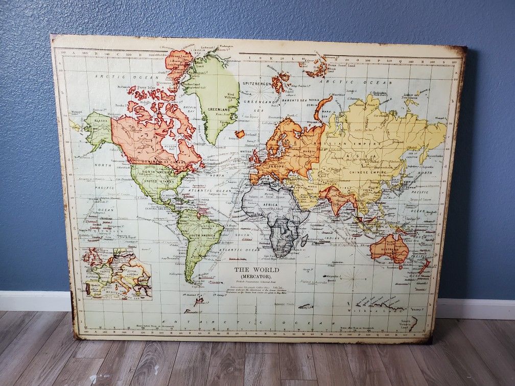 Pre-owned (as-is) in good condition. The only reason we are selling this is due to changing my son's room decor. It is taking up space on the wall. It's a beautiful old style map. I don't know much about the artist or product. You can search for similar item online on Wayfair or Google. You are welcome to take a look at the item before purchasing. Pick up only from Tracy. Serious inquiries only, please and thank you. $150 or OBO Size: 40" H x 50" W x 1.5" D