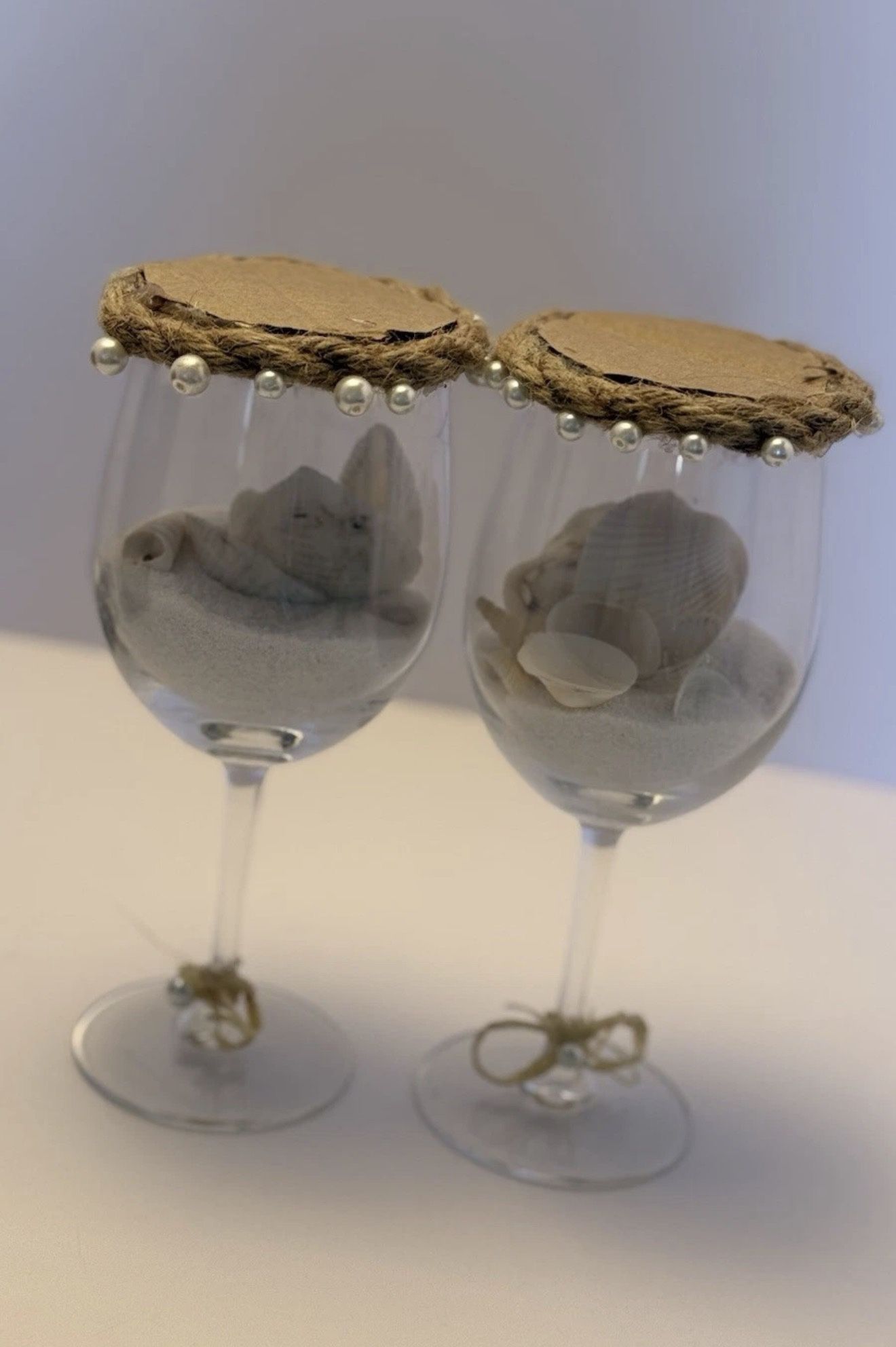 Handmade Beach Decor Wine Glasses with Shells & Sand – Set of 2