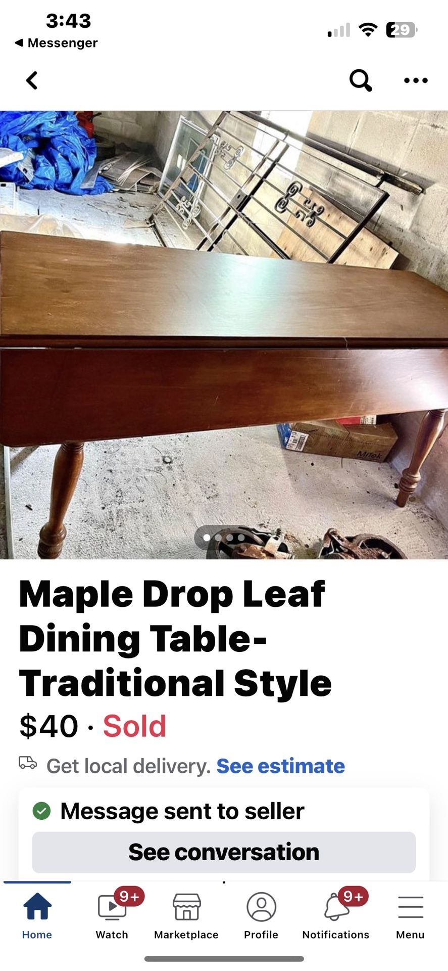 60" wide with leaves open. Perfect size for eat in kitchen. Also can be used as a sofa table for extra seating in a smaller home/condo/apartment. $75.