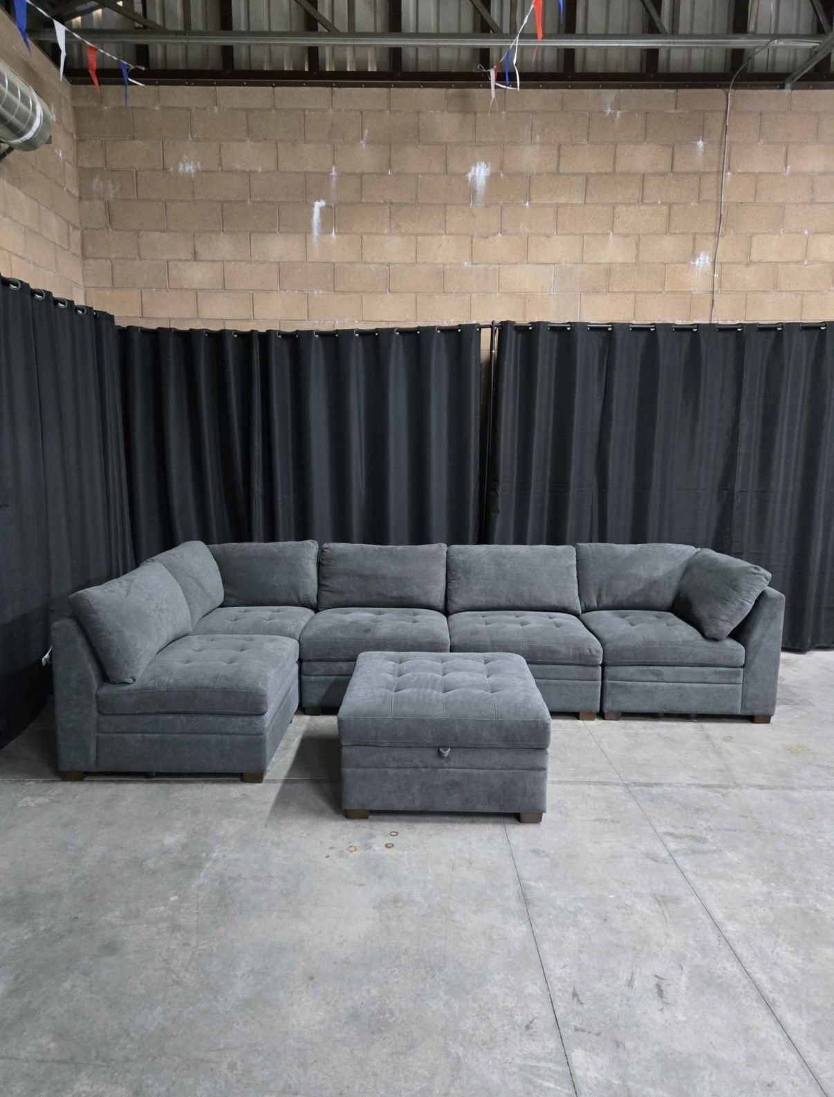 Thomasville Tisdale 6-Piece Modular Sectional You can even create a big bed for movie nights! Features: ✅ Modern Style with a Clean Look ✅ Configurable Modular Design ✅ Tufted Seat Cushions with Comfortable Pocket Coil Seat Construction ✅ Storage Ottoman with Generous Storage Space Overall Sectional Dimensions: 142.5" L x 71.2" W x 36.7" H 🚚Doorstep Delivery: AVAILABLE (Please inquire) ⏰Delivery time: SAME DAY 💵Payment: Cash, Zelle, Venmo, CashApp or Apple Pay INQUIRE TODAY to set up a delivery time or you can pick up FREE DELIVERY WITHIN 20 MILES DELIVERY FEES APPLY OUTSIDE 20 MILES 🚨I get new inventory all the time!🚨