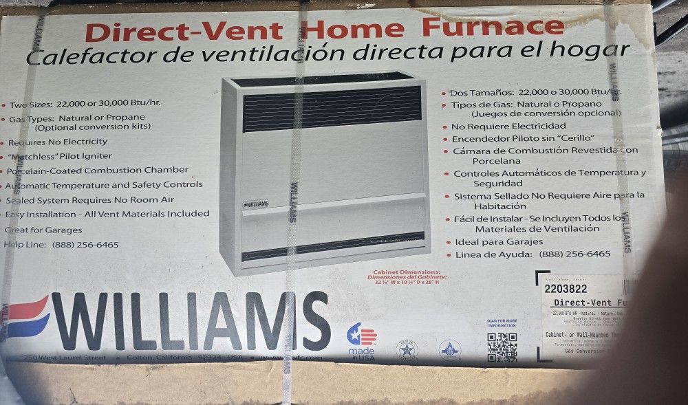 Williams Direct Vent Home Furnace 22,000 or 30,000 Btu /hrs Gas