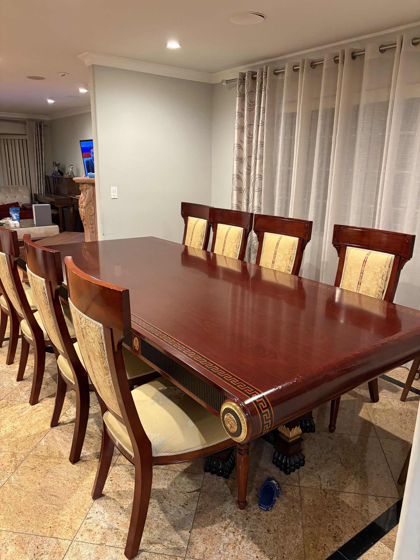 I’m selling our Versace style dining room set. Selling as a set. It has been used very minimally since we bought it. Well kept. The sides of the tables have some damage. Set was originally purchased for $12,500 It is a solid wood table and set. I’m am pricing this very fair since I am starting remodeling I also have the complete bedroom set on my profile. Please refer to my other posts
