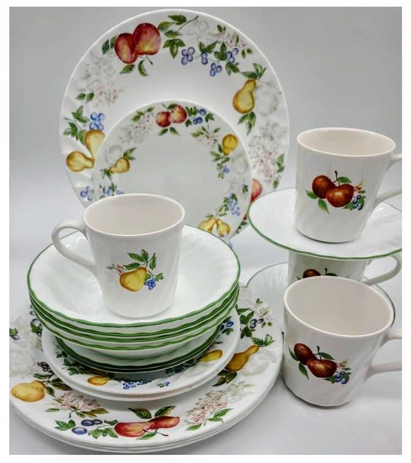 What's in the Box 4 place settings. Each place setting consists of: 10-1/4-inch dinner plate; 7-1/4-inch salad plate; 18-ounce soup/cereal bowl; 6-inch saucer; 9-ounce cup. 20 pieces total. Thermally bonded, tempered-glass construction; strong, lightweight, and chip-resistant Swirled, scalloped borders and smooth centers; harvest-inspired color palette Dishwasher-, oven-, and microwave-safe;