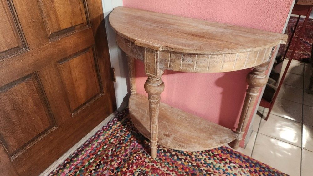 Solid wood, not heavy. Sturdy, doesn't wobble, lovely patina,new, moving Manchester brand console
