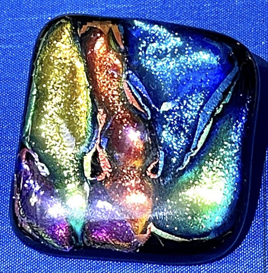 I’m liquidating my daughter’s box of dichroic pieces and this is a favorite! The radiant colors shine brilliantly in low light and make quite a statement in the sunlight! This is about 1.25” sqr.