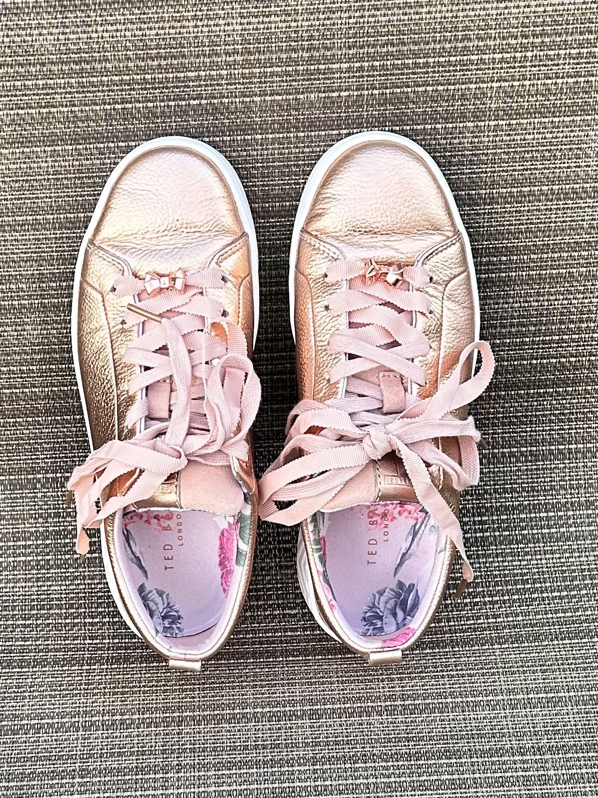 Ted Baker London women’s size 6 fashion sneakers. Classic leather sneaker finished in metallic rose gold, round toe, rose gold bow charm, lace-up ties, contrast heel tab, white grip sole (the color looks gold in the picture due to the lighting, the color is actually a rose gold metallic)