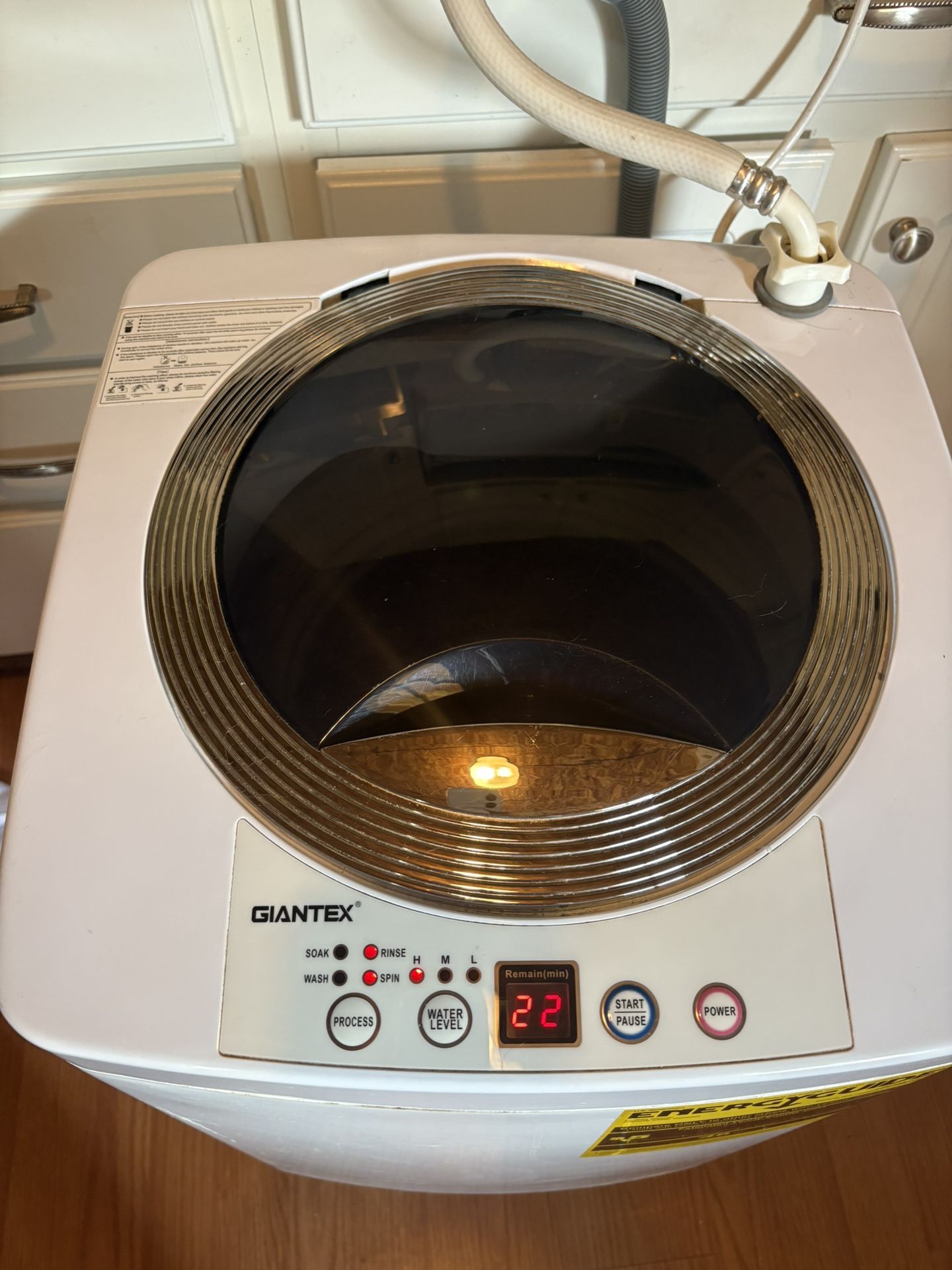Portable washer that hooks up and drains into the sink! It is an easy set up and includes the instructions and attachments. It works very well and is great for small spaces! Pick up by 6/15! Price is negotiable!