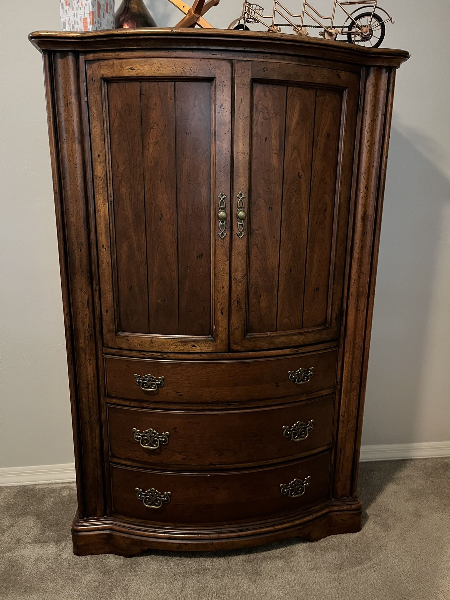 Selling a high-quality armoire in excellent condition from a smoke free, pet free home. This piece offers plenty of storage and works great for clothing, linens, or general organization. Approximate dimensions: H: 65” D: 15” W: 41”
