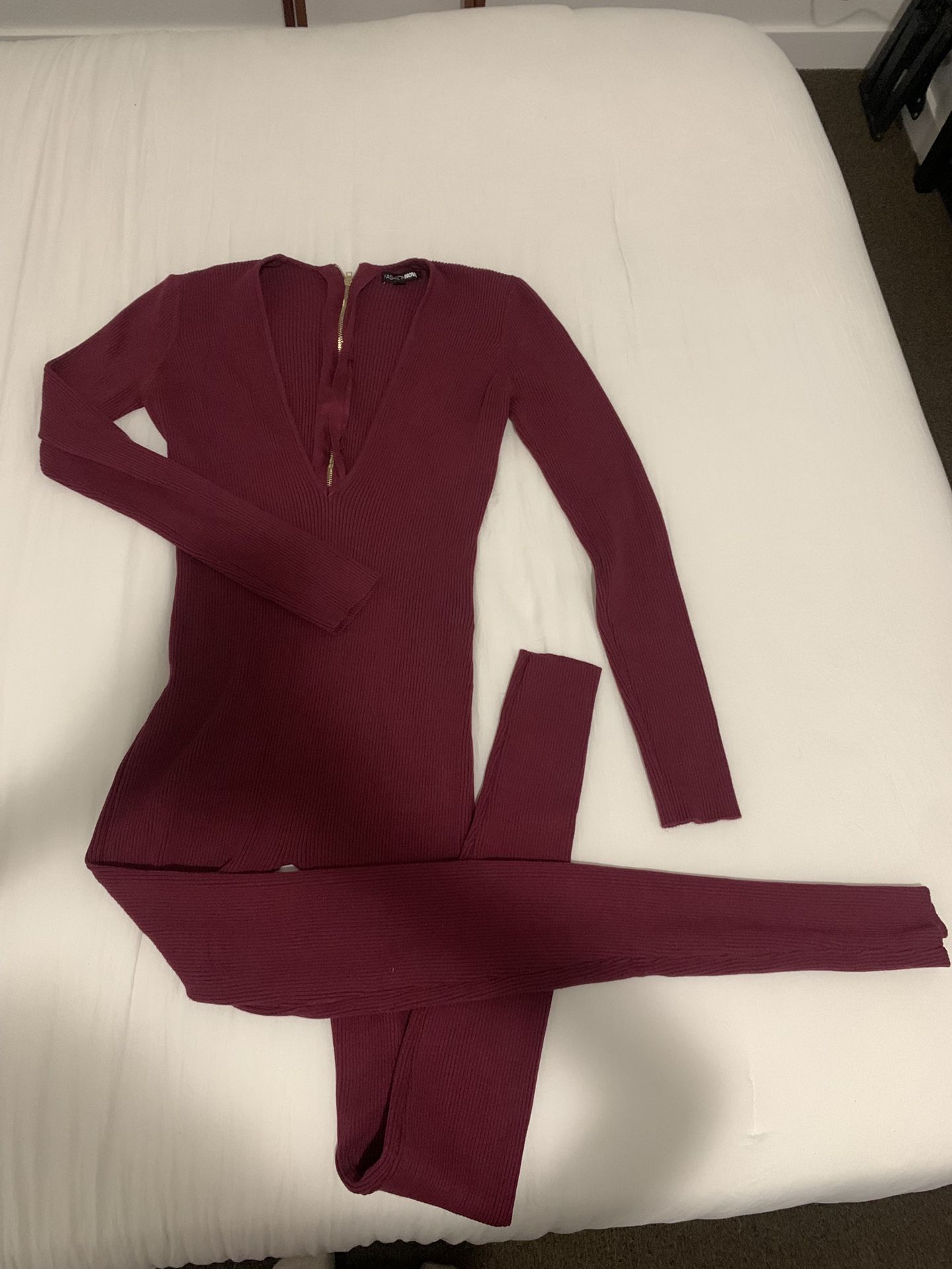 Ribbed Fashion Nova jumpsuit. Has long sleeves and a v-neck. Zipper front. Super comfy burgundy color.