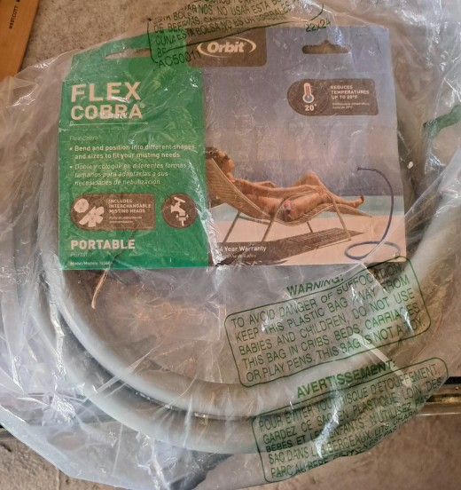 Orbit Flex Cobra personal mist cooling sprayer, a portable mist stand designed for outdoor cooling. It features a flexible "cobra" design that can be bent and positioned into different shapes to direct the mist. The system attaches to a standard garden hose. It includes three brass and stainless steel mist nozzles. It can lower the ambient temperature by as much as 20 degrees Fahrenheit. The product is portable and suitable for use while sunbathing, gardening, or relaxing outdoors.