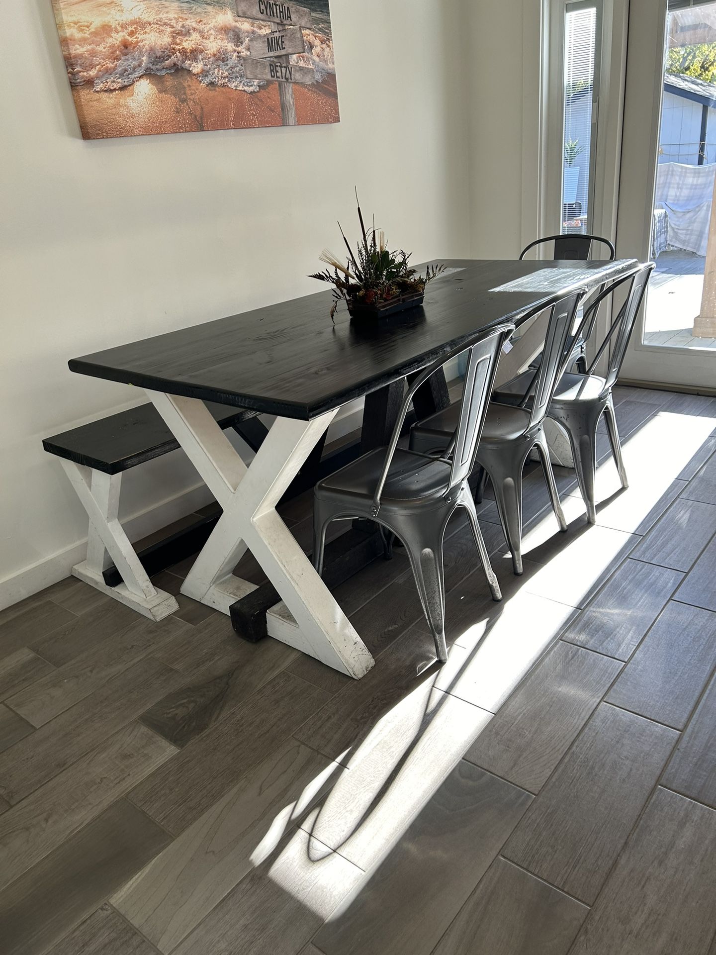 % madera con banca y 4 sillas, excelente calidad y condición . Mesa mide 70” x 35”