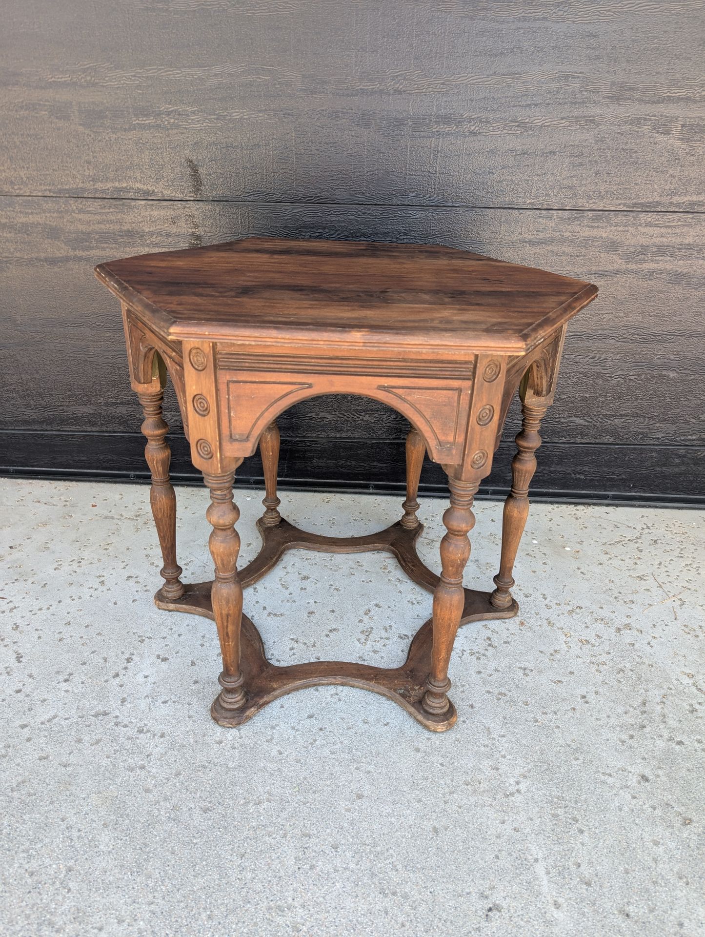 Vintage wood table with a cool hexagonal top. It has ornate carved legs and a unique star-shaped base. Dark finish on the wood. Great as a side table or accent piece. Could use some staining or refinishing. See photos for measurements and ask any questions you may have. Located in Corona at the 91 and 15 freeway interchange. If the post isn't marked sold, it's available. Please see my other listings and let me know if you'd like to bundle a set.