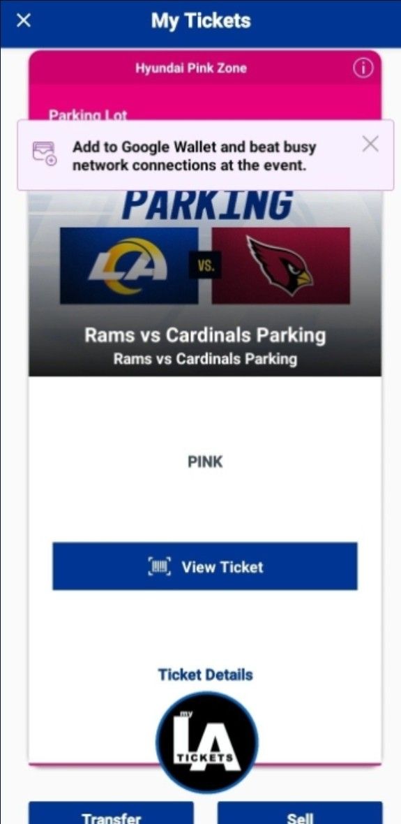 1 RAMS VS CARDINALS 1/4 - PINK LOT TAILGATE PARKING PASS - $125