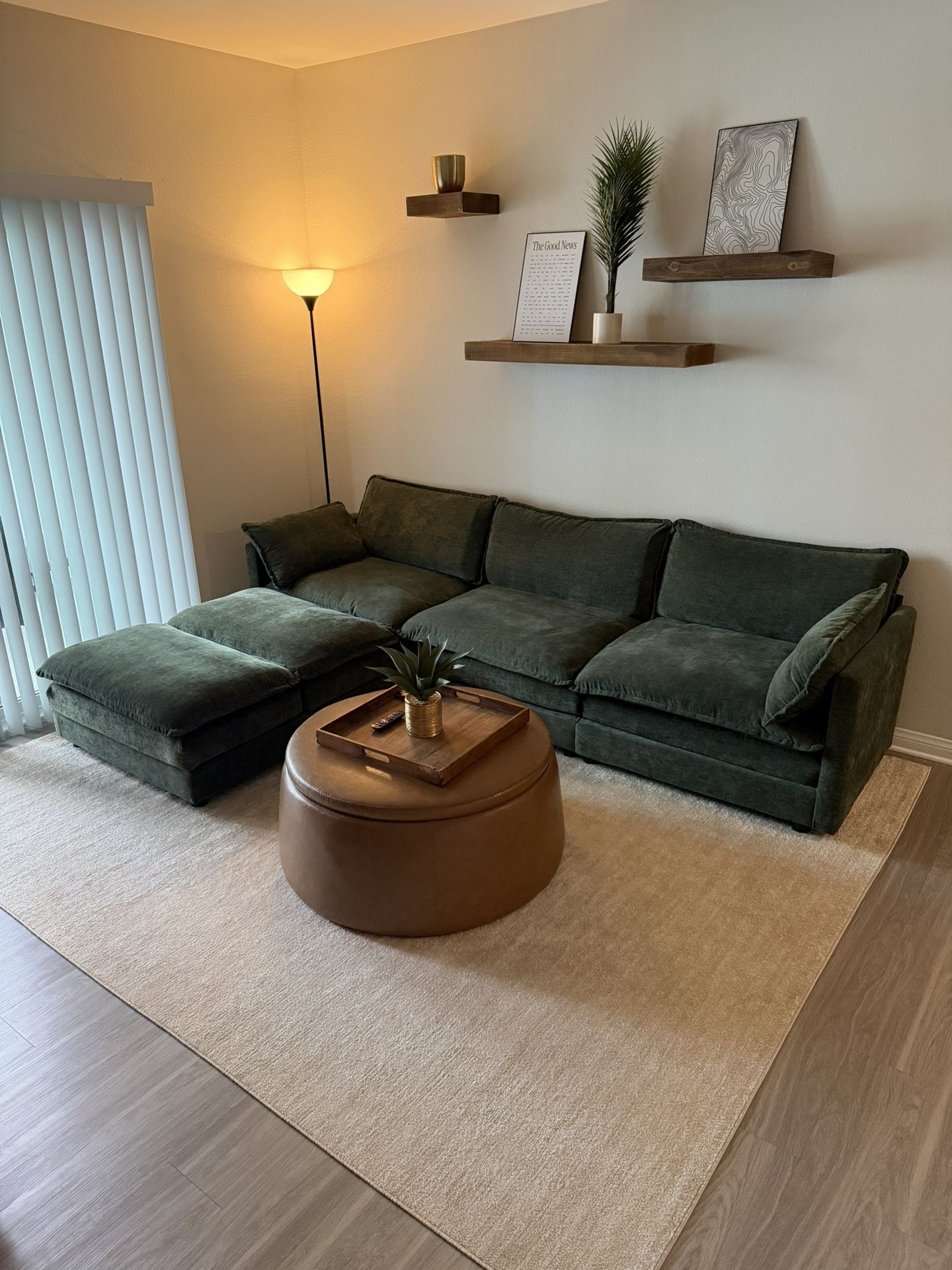 Green Chenille Sectional with Chaise – $450 TODAY Modern green chenille sectional with chaise in excellent condition. Super comfortable with deep seating and clean lines. • Approx. 112” wide • Movable chaise • Soft chenille fabric • No stains, no damage • Smoke-free home Originally $800. Asking $450 firm. Pickup in Temecula/Murrieta. Available TODAY only. First person to pick up gets it. Message me if you’re ready to come now.