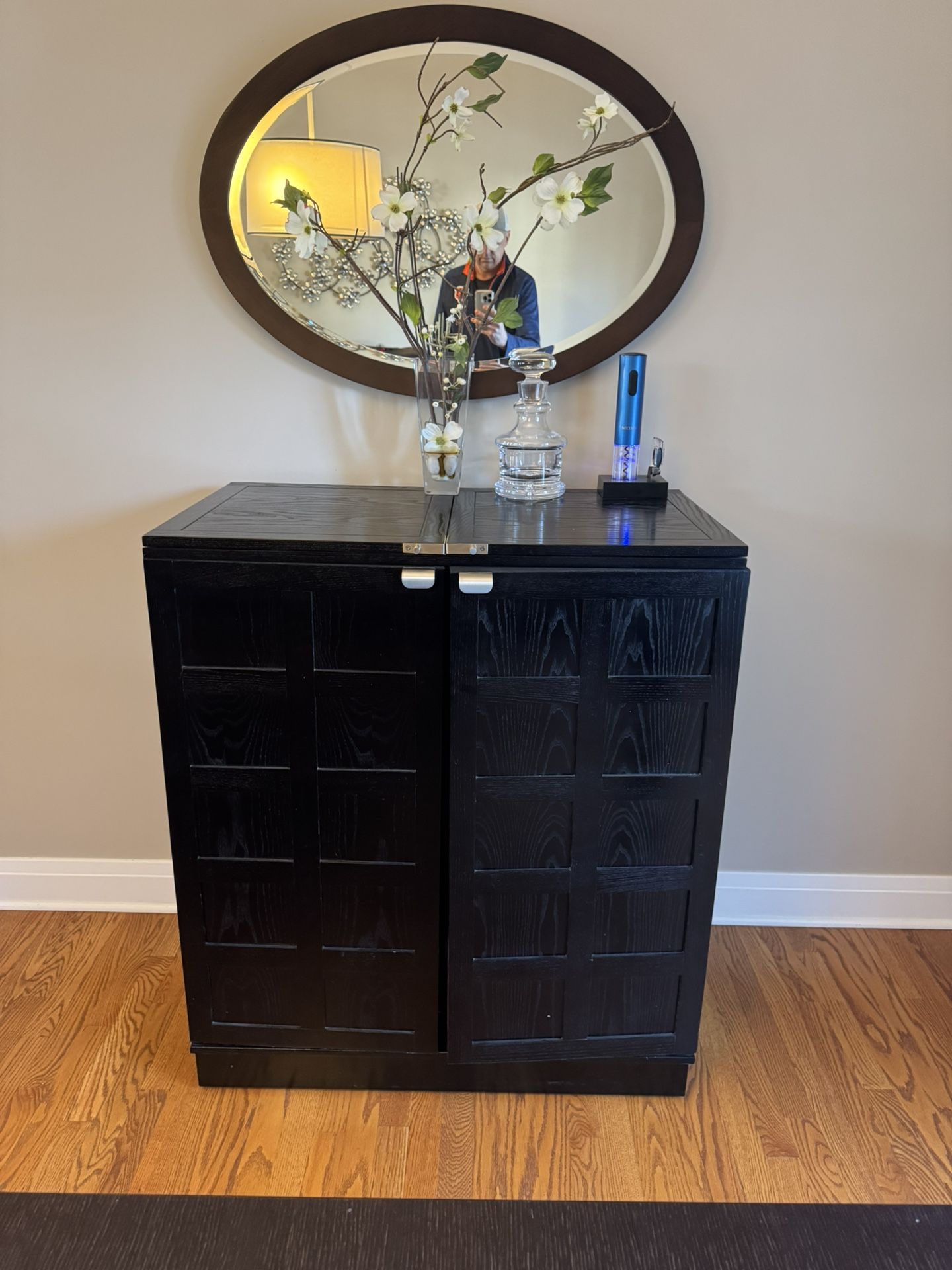 Good condition. Quality piece. See other pieces for sale in photos. Color: Black 36L x 20D x 42H Originally purchased from Crate and Barrel. Contents of cabinet not included. Cash Only Pickup in Naperville, near Naperville central HS.