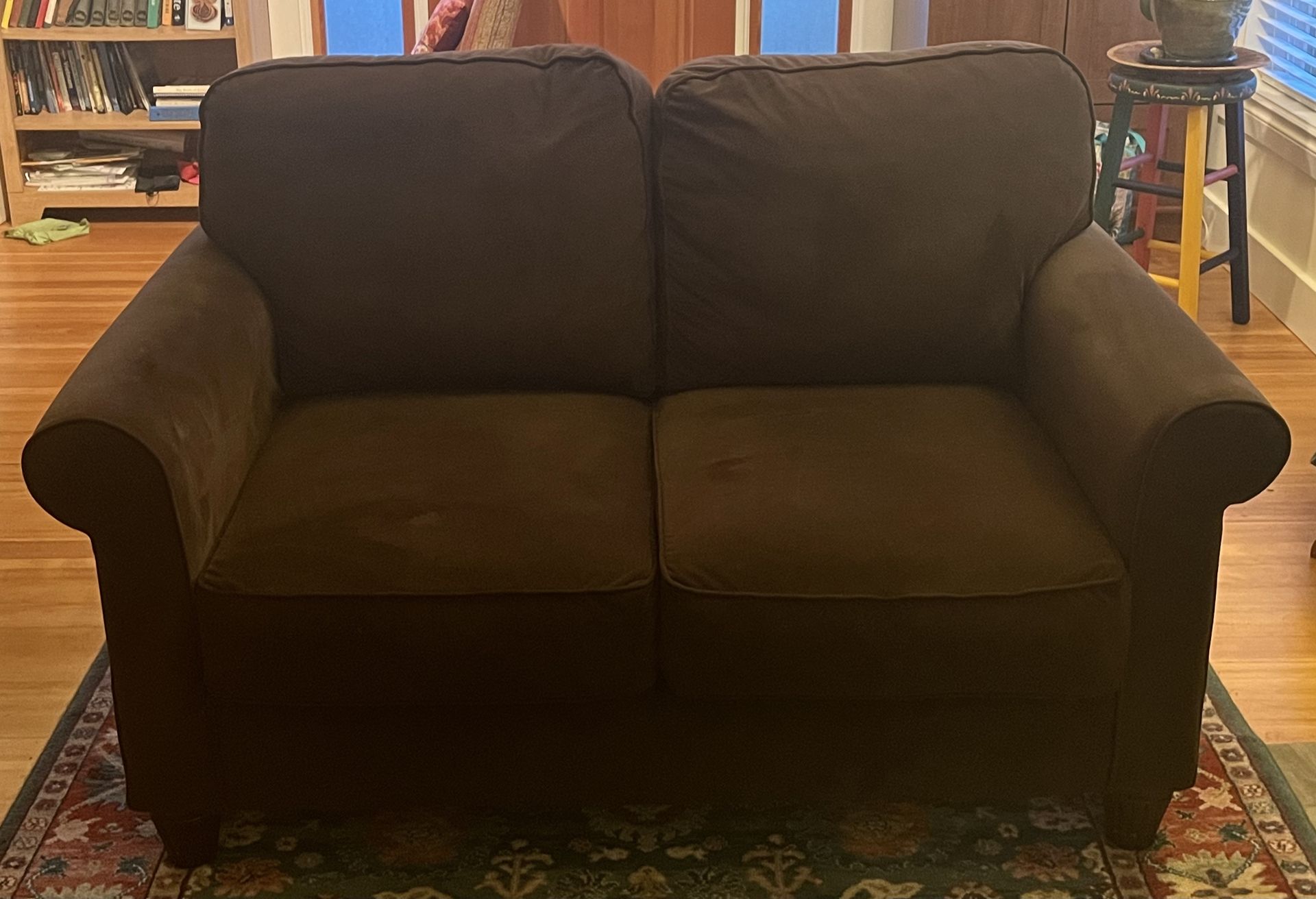 Brown two cushion loveseat. Clean and in good condition. 58 “ long 37” tall 35” wide