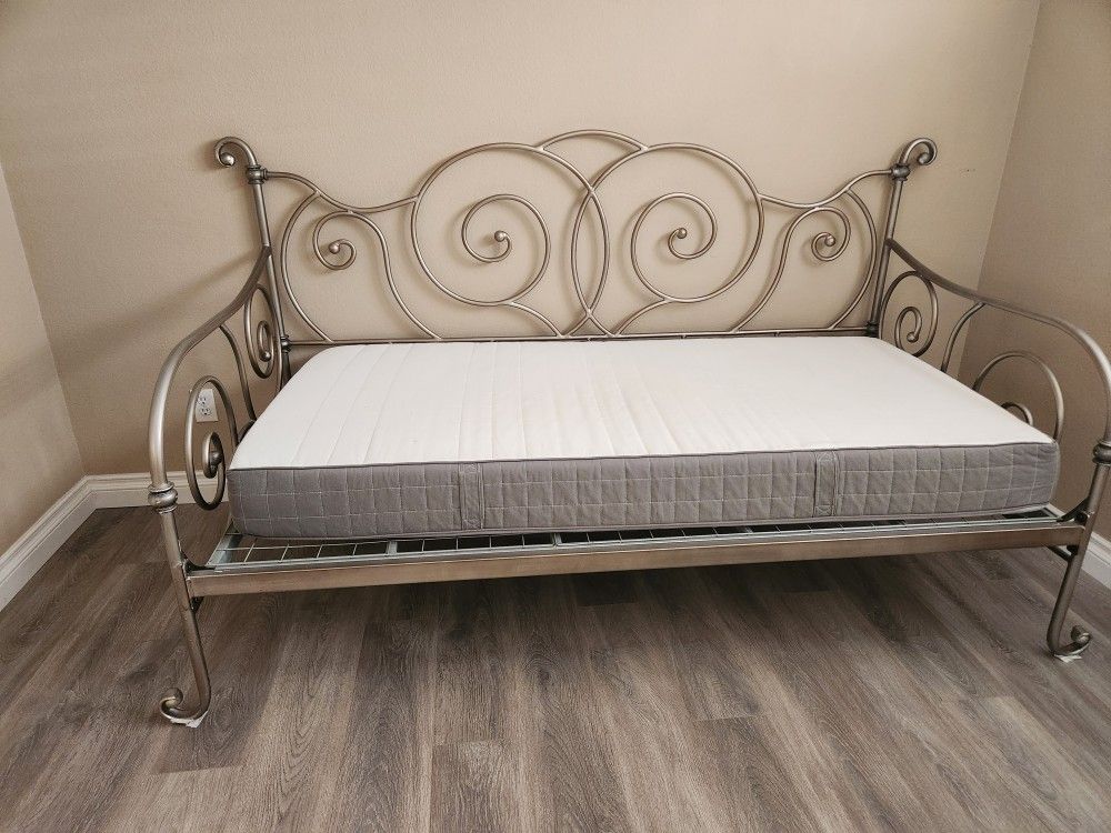 Metal frame, from pet and smoke free home. was used in my spare bedroom. You are welcomed to take the mattress if you need one, this matters always had a cover on while in use. The mattress in picture is a twin size. There are a few scratches on the frame but nothing outrageous and there's no structural damage or dents. L85"×W42"×H47"