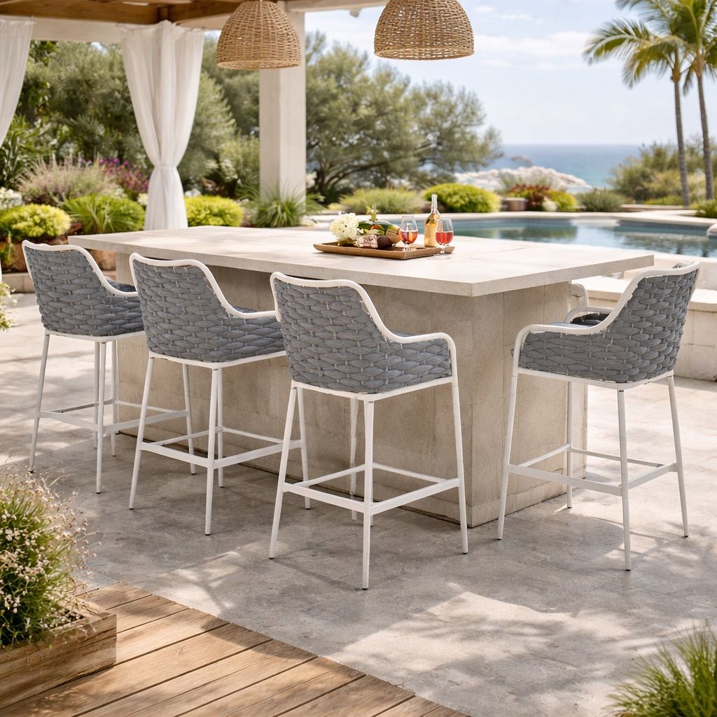 New Set of 4 30” Outdoor Bar Stools, Modern Patio Bar Chairs with Steel Frame, Ergonomic Backrest & Cushions, Weather-Resistant, Lightweight & Sturdy,