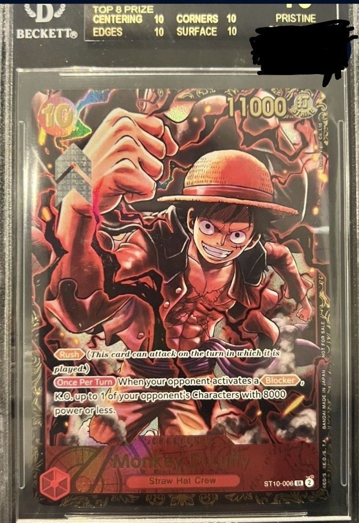 One piece Luffy One piece promo Regional top 8 prize Bgs 10 Black label eBay has two listed $33,000 And $32,000 Will listen to offer's. Cover/1st pic is my card Other 2 are the ebays