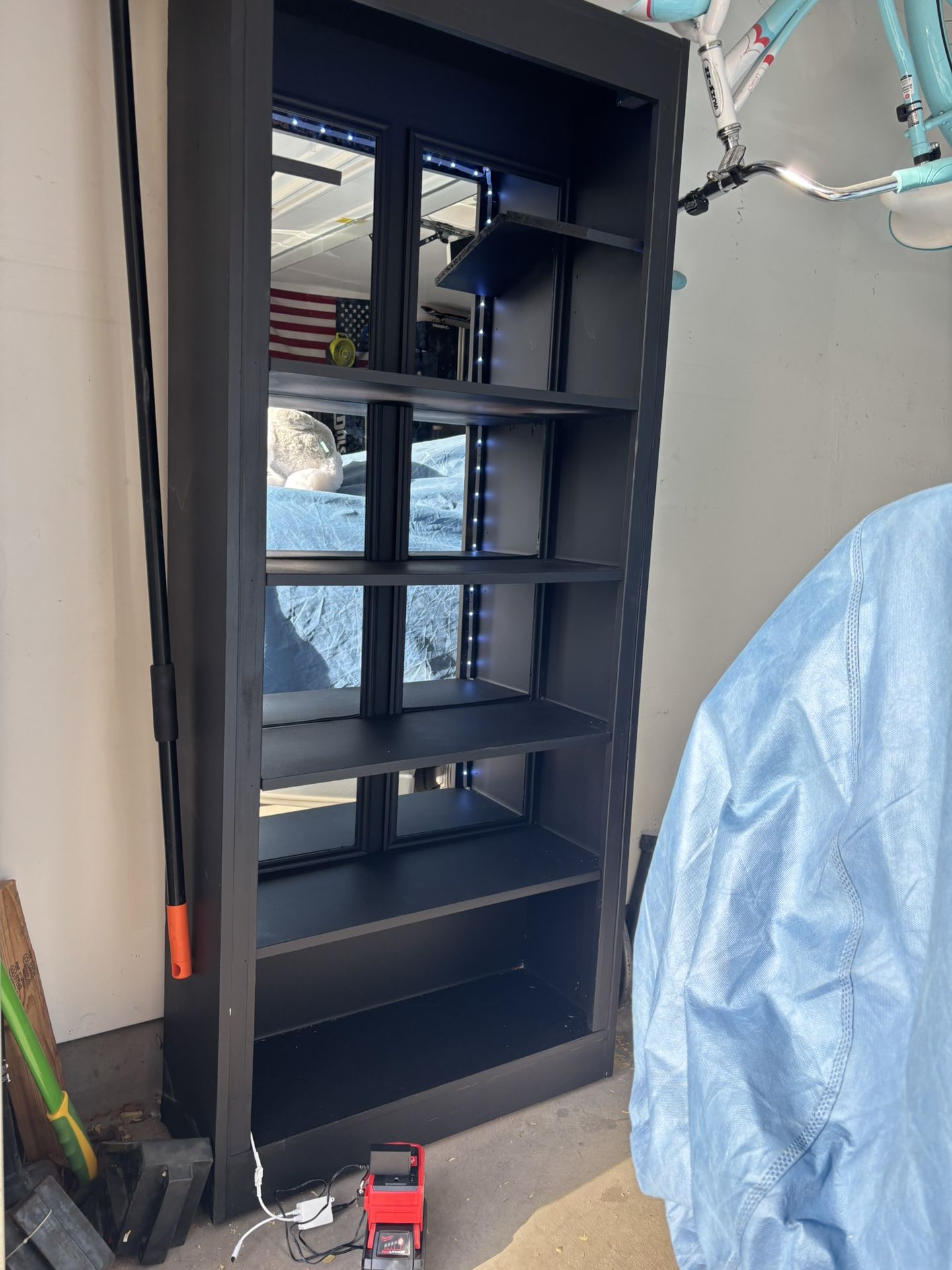 Black Bookshelf / Cabinet I custom adjusted the shelves, added mirrors, and installed LED lights that are multicolor and are controlled with a remote. Used as a toy car display but it’s too small for my collection Can be used for books or toy displays or whatever displays you want $25 obo