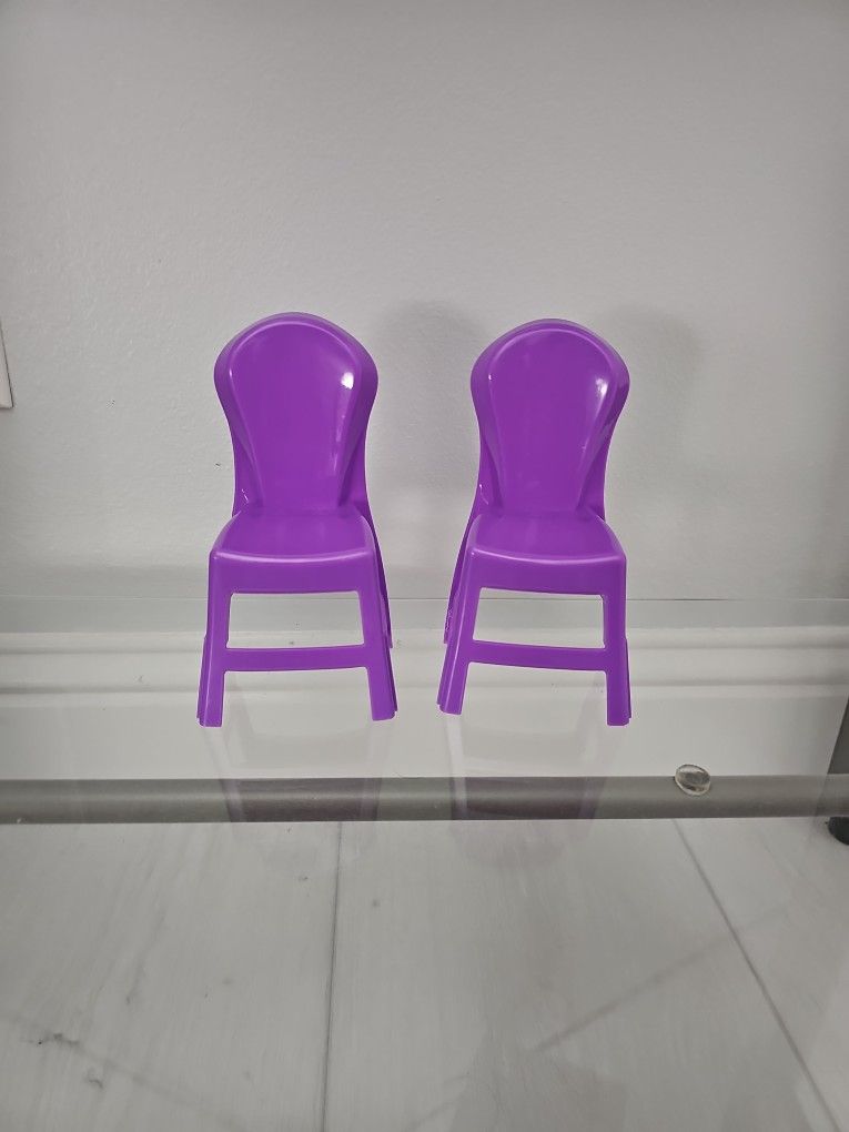 These are plastic purple chairs that can fit Barbie dolls; preferably ones that can bend their legs. They are a dollar each.