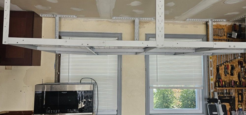 GearLoft Hammered White Adjustable Height Metal Overhead Storage Rack (48 in W x 96 in D) Rack can be dismantle if needed.Currently Empty and ready to go.Instruction can be provided for ease of installation if needed.