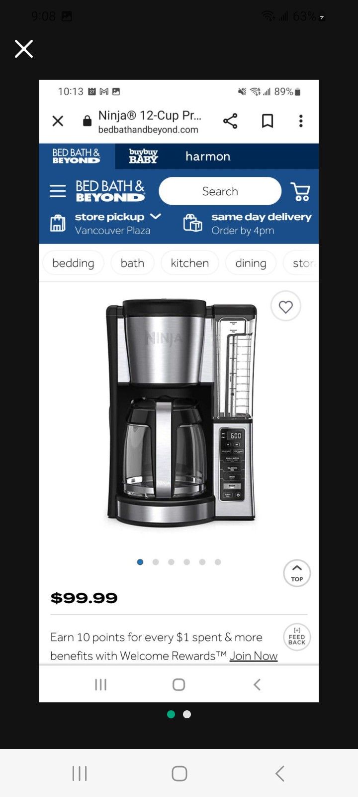 **BRAND NEW** Highlights Custom brew strengths: Classic or Rich; flavorful and never bitter. Hotter brewing technology: Advanced boiler for piping-hot coffee. 24-hour programmable delay brew: Prepare your hot brew in advance. Adjustable warming plate: Keeps coffee hot up to 4 hours. Convenient 60-oz. removable water reservoir: Makes filling easy. Mid-brew pause: Snag a cup before your brew is complete. Description Ninja Coffee Brewer is a 12-cup programmable coffee maker with custom brew strengths and hotter brewing advanced boiler to ensure your coffee is hot, flavorful, and never bitter. From a small batch (1–4 cups) to a full carafe, Classic or Rich strength, you can expect the same great taste. Our removable water reservoir allows for easy filling without the mess. rest assured your coffee grounds will be evenly saturated for uniform flavor extraction and delicious taste. Specifications Dimensions (Overall): 14.6 Inches (H) x 10.5 Inches (W) x 9.9 Inches (D) Weight: 6.5 Pounds Capacity (Volume): 12 Cup Features: Programmable, Transparent Water Tank, Digital Clock, Push Button Controls, Brew Pause Cup Capacity: 12 Mount Type: Free Standing Includes: Glass Carafe, Removable Water Reservoir Safety and Security Features: Nonslip Base Coffee Filter Type: Permanent Screen Filter Coffee Type Used: Ground Coffee Wattage Output: 1100 watts Material: Stainless Steel