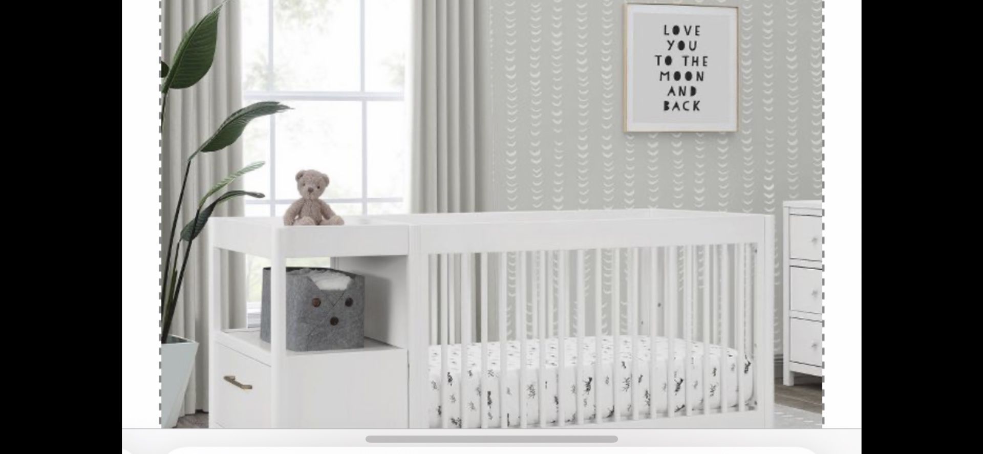 Description The Zoe 5-in-1 Convertible Crib and Changer by Delta Children is perfect for small nurseries. The crib’s attached changing table, drawer and open storage shelf will help busy parents stay organized and keep essentials within reach. Plus, its versatile design gives you the option to attach the changing table on the left or right side of the crib, and it can be used as a standalone side table when the crib is converted into a full size bed. This multifunctional crib saves precious square footage and looks good while doing it, the round spindles and brushed brass drawer pull add a modern touch. Built to accommodate your baby from birth through their teenage years, this crib features three adjustable height levels that can be lowered as your child begins to stand, and it converts from a crib to a toddler bed, sofa, daybed and full size bed. It’s everything you need for your nursery in one beautiful piece. Available in Bianca White and gray. Daybed/Sofa Rail and Changing Pad included; Toddler Guardrail #W100725 and Full Size Bed Frame sold separately.