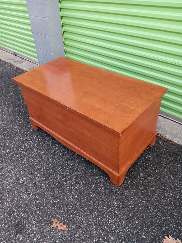 44"×22.5"×22" tall. Solid real wood. Good condition. Cedar-lined. Lock disabled for safety. Some finish blemishes. Pickup only #672