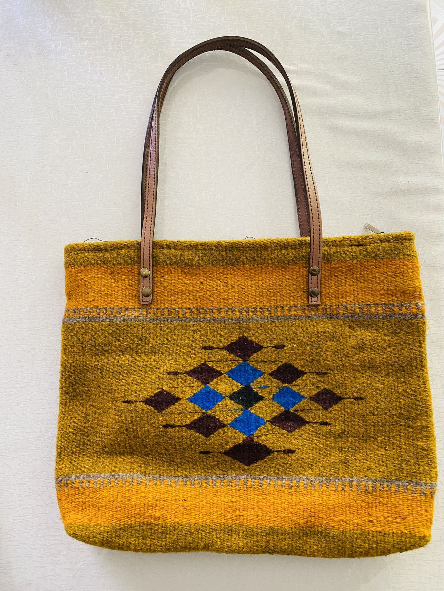 Made in Teotitlán Del Valle where they are known for its textiles, which are woven on hand-operated looms, from wool obtained from local sheep and dyed mainly with local, natural dyes. They combine historical Zapotec designs with contemporary designs to make beautiful pieces like bags and rugs. Each purse is lined inside and has a small cellphone pocket with a zipper top closure and leather straps I’m located in Rowland Heights