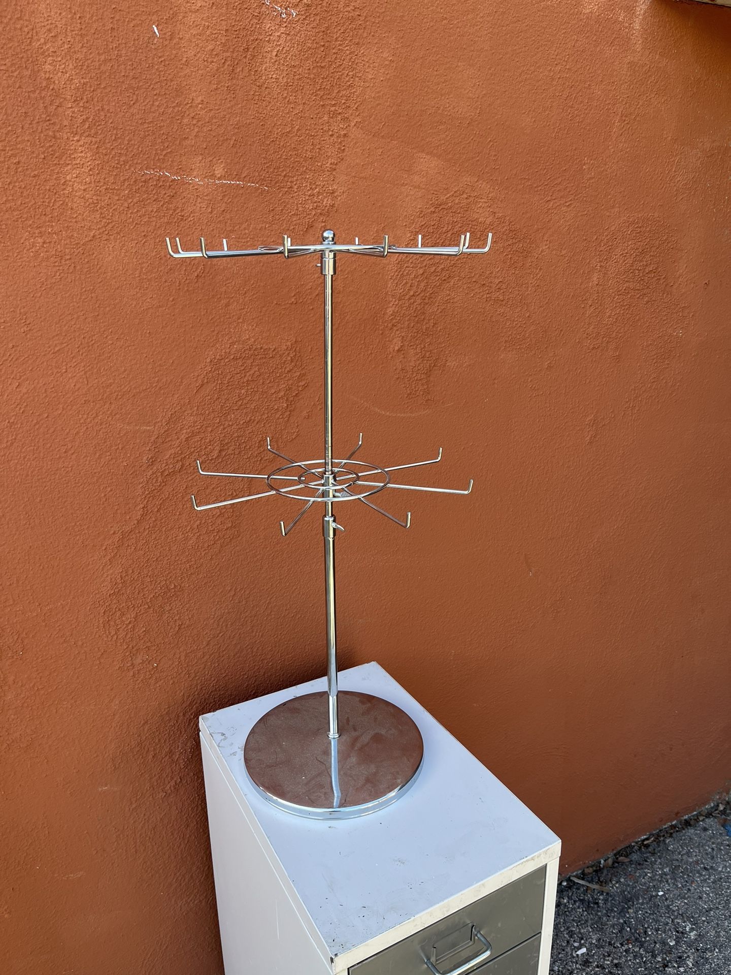 Chrome Adjustable Spinning Display Carousel – 2-Tier Countertop Retail Rack (16 Hooks) ⸻ Description Chrome metal rotating display carousel, ideal for retail stores, flea markets, craft fairs, pop-ups, or garage sales. Clean, professional look with a smooth-spinning design that makes merchandise easy to browse. • 2 adjustable tiers • 8 hooks per tier (16 total hooks) • Freely spins / rotates smoothly • Height adjustable – tiers can be raised or lowered • Breaks down easily for transport or storage • Approx. 26” total height • Approx. 16” height between rack positions • Sturdy weighted base for stability Great for displaying jewelry, keychains, small packaged items, accessories, tools, or impulse-buy merchandise. Chrome finish presents items cleanly and professionally. Condition: Appears clean and fully functional. Spins freely. See photos for exact condition and layout.