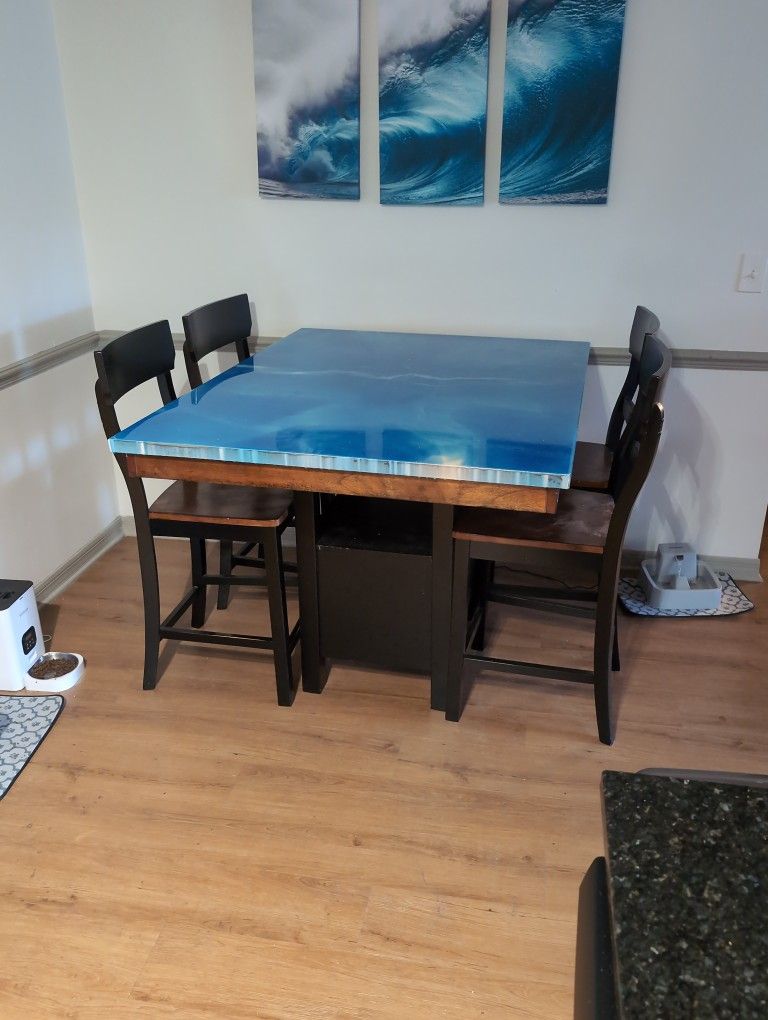 Comes with chairs, good condition. 41.75' x 53.75' Custom epoxy coating top. Small storage at table base.