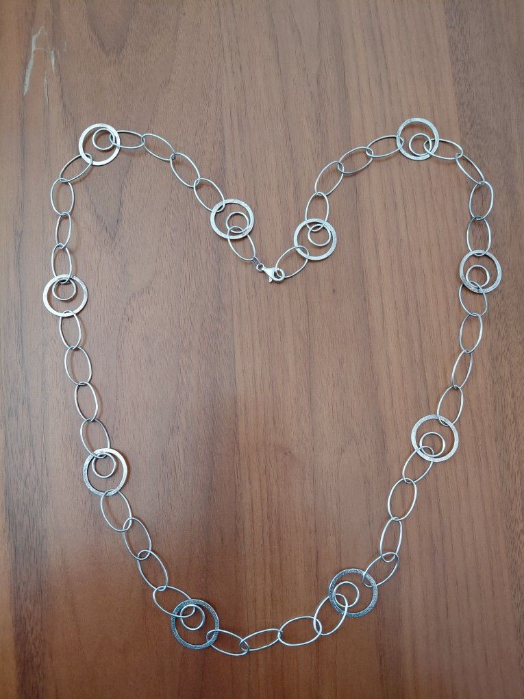 Beautiful long sterling chain necklace. Alternating polished oval and textured circle links. Classic Milor Italian style. Lobster claw clasp. Great Valentines Day gift. I will polish if you desire or leave that to you.